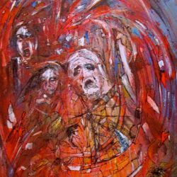 Acrylics, fluorescent and phosphorescent, on linen canvas, natural light at the top, wood light at the bottom left, total darkness on the right