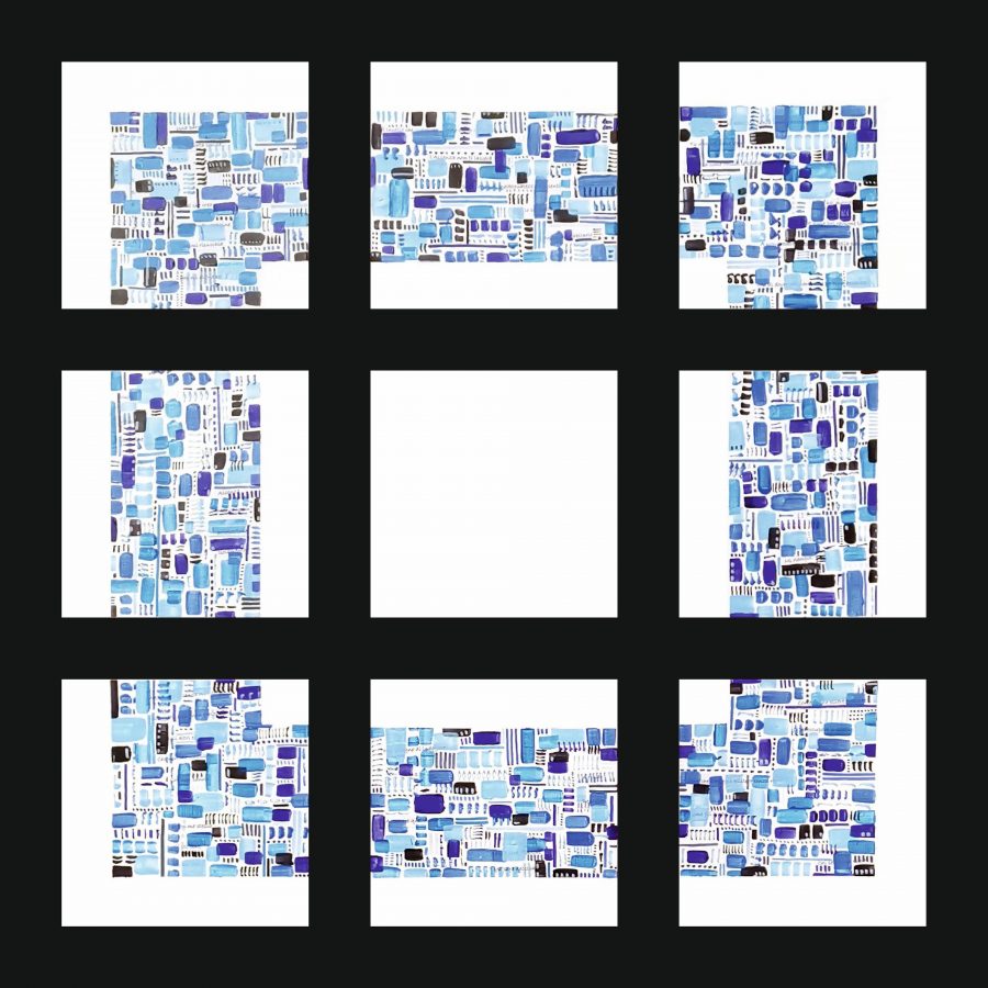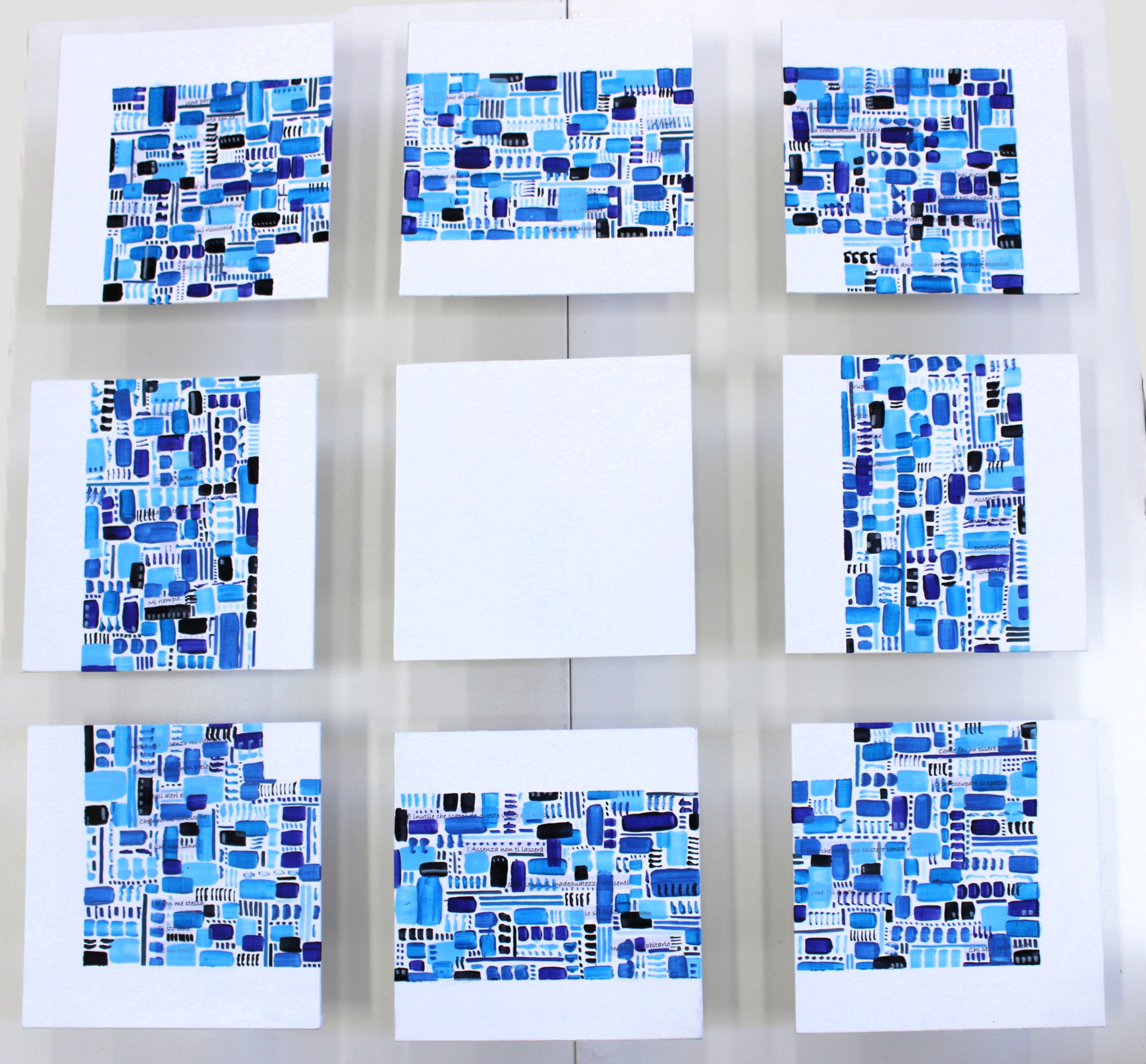 The work consists of nine canvas boards (20 x 20 cm) to be wall-mounted using the specific hooks provided on the back. Each piece must be positioned at a distance of 5 cm from the others. The boards are mounted on a polystyrene support and created using an acrylic-on-canvas technique and collage. This is a modular work in which the nine canvases are arranged in a square structure, interrupted by a central void: the Hole. This physical absence becomes the focal point of the work, representing the human condition of inner lack. Drawing inspiration from Chandra Livia Candiani’s reflections in "Silence is a Living Thing" and the acceptance of emptiness described by Anna Llenas in "The Hole", the piece invites us not to fill this void with "temporary plugs". On the contrary, it urges the observer to inhabit the emptiness, recognizing it as a vital space of authenticity and awareness, while resisting the illusory pursuit of superficial well-being.
