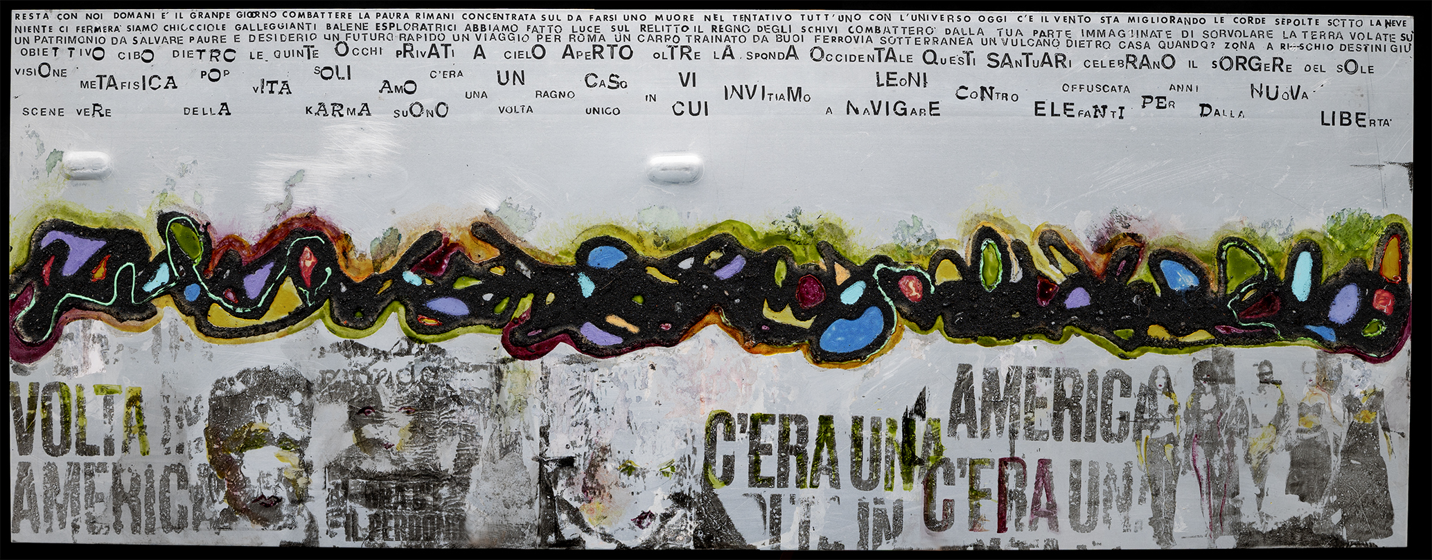 In the lower section, worn images and writings ("There Was an America") emerge as remnants of historical and cultural memory, partially erased but impossible to completely eliminate. The metal amplifies the sense of permanence and conflict: what is painted can be covered, but not forgotten. The work thus emerges as a reflection on contemporaneity, on the stratification of experience, and on the human attempt to leave a lasting mark in an unstable world.