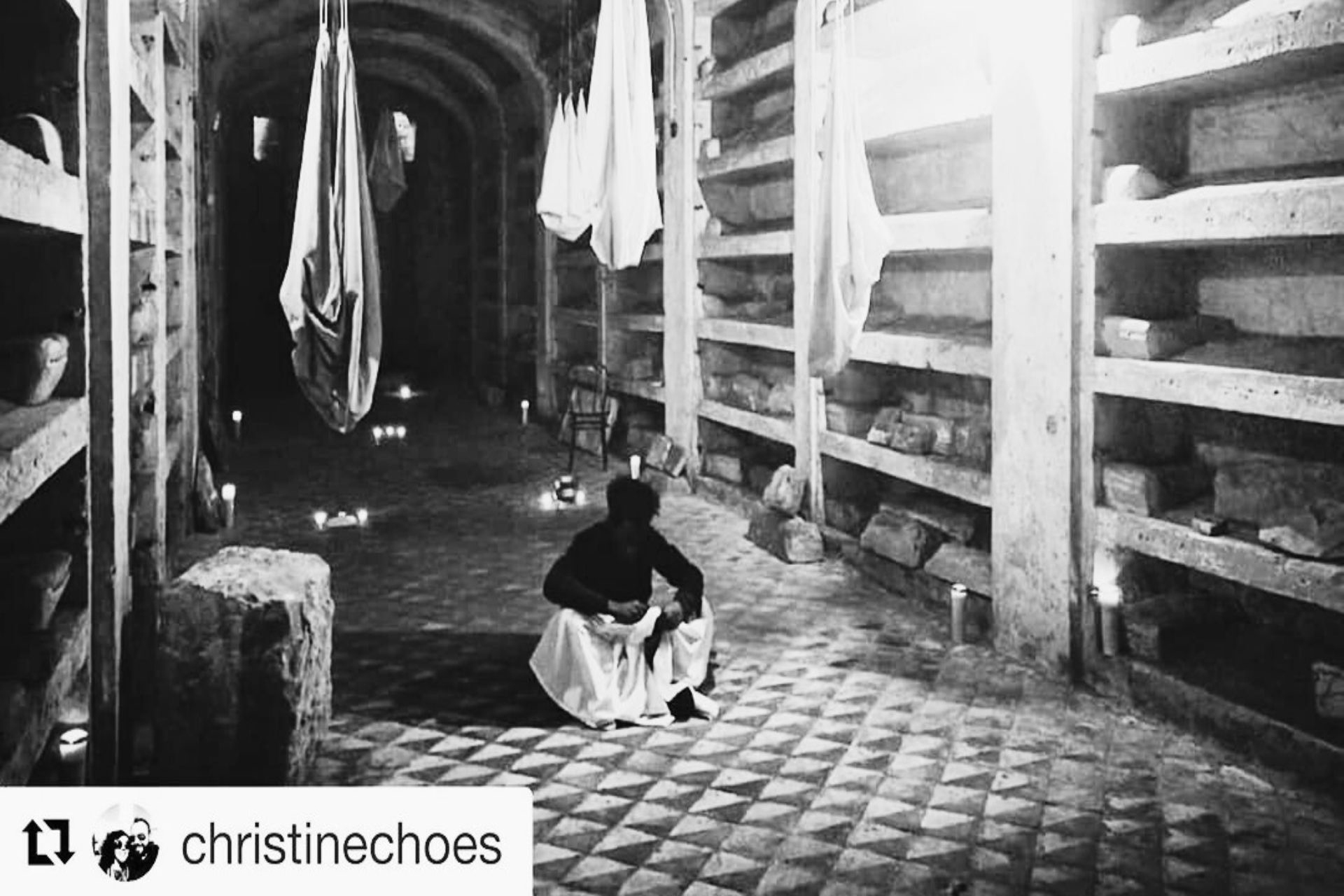 El Hilo is a performance exploring gesture, memory and migration. Inside a historical ossuary, the performer hand-stitches a red thread onto a cloth used by manteros, transforming a precarious material into a surface of vulnerability and resistance.