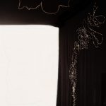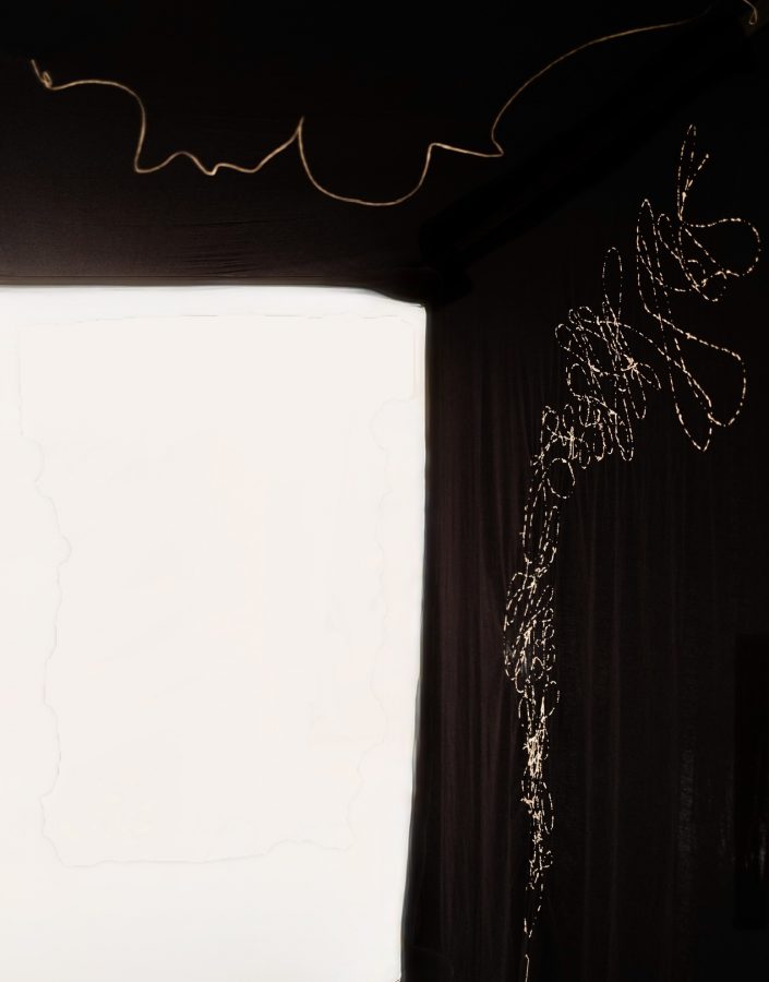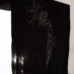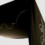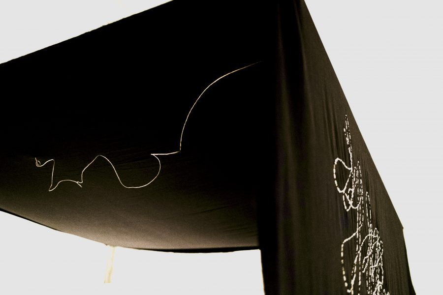 Embroidery in Morse code on an unstitched black bedsheet, suspended as an installation, with sound from the artist’s studio.