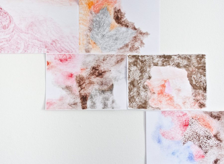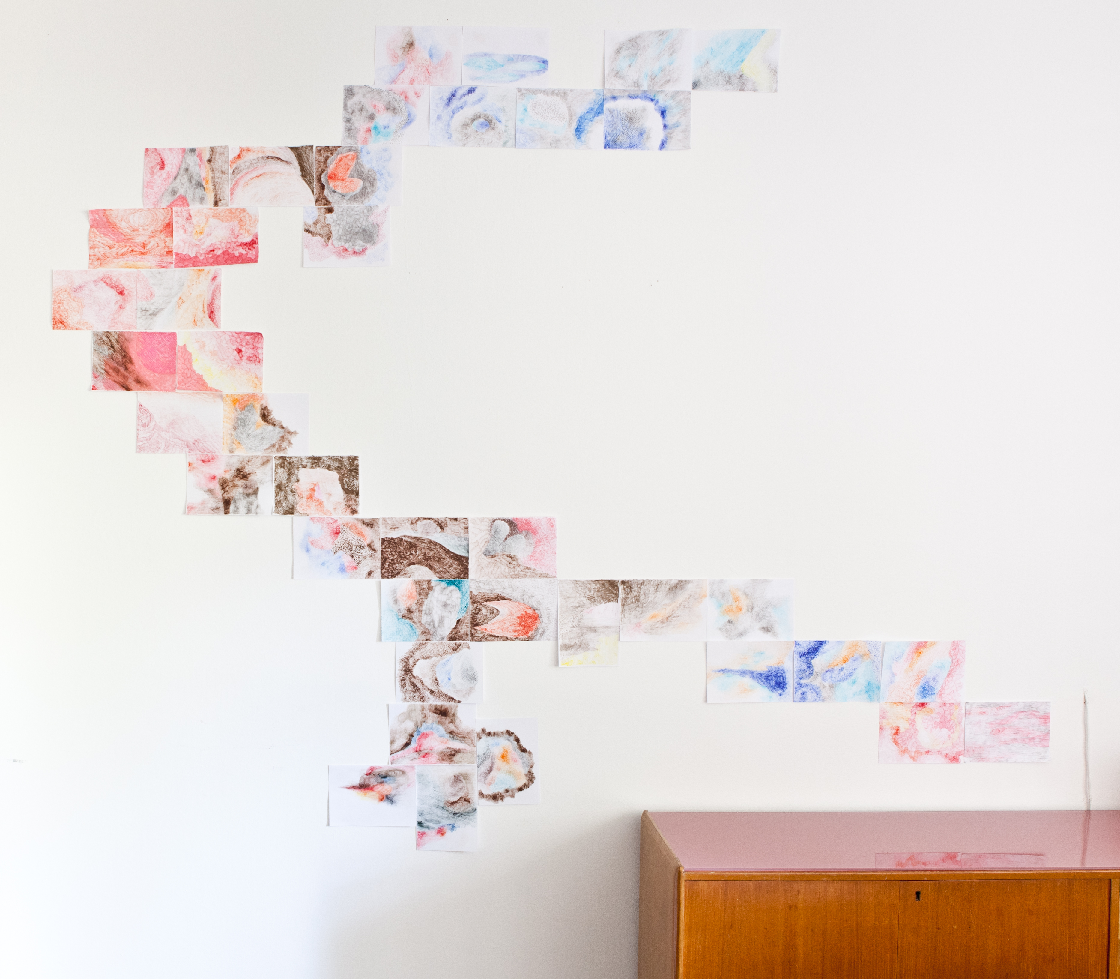 I resumed the action, begun in one of my first works, of filling time and space with a very simple gesture that results in a big drawing, with long and slow growth. In this case it is an informal gesture, with shapes that spring freely, using different colors. Supplies is daily, very banal, a ream of A5 sheets and almost exhausted markers. I like the visual effect that is created, slightly blurred, not very controlled.