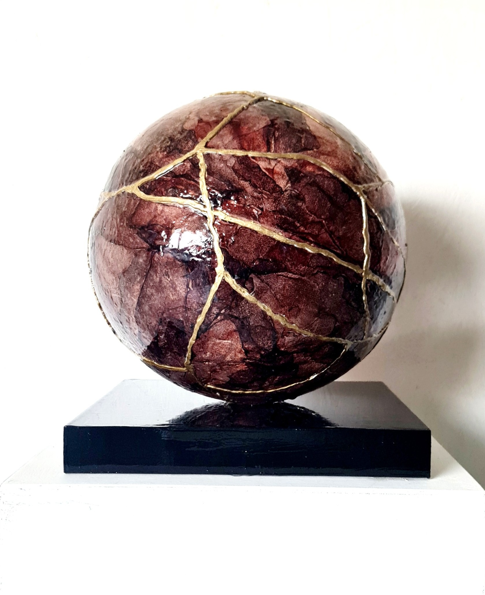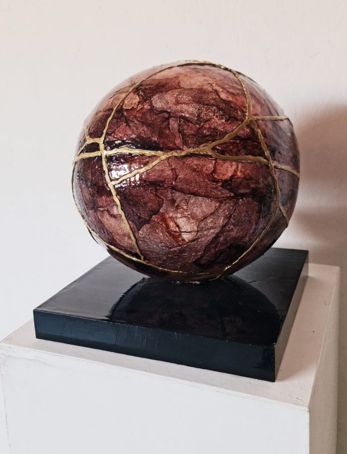 Geo Reintegratus combines organic forms and memory, evoking the natural processes of transformation and resilience. Gold, a symbol of care and rebirth, is engraved on the surfaces as a sign of healing, following the philosophy of kintsugi, where fragility is not hidden but made precious. Sepia black and leather, living materials in constant evolution, interact with the textures of skin and fibers, suggesting a balance between vulnerability and permanence. Gea Reintegrata, mixed media on fiber, leather, and squid ink, gold pigments, methacrylate, wood.