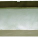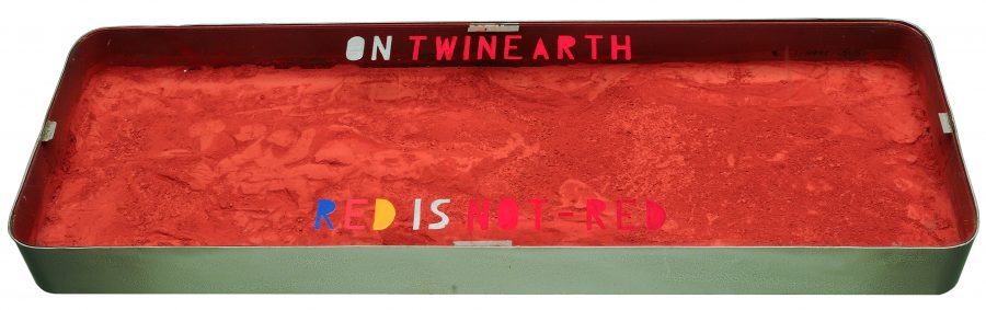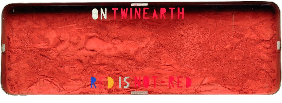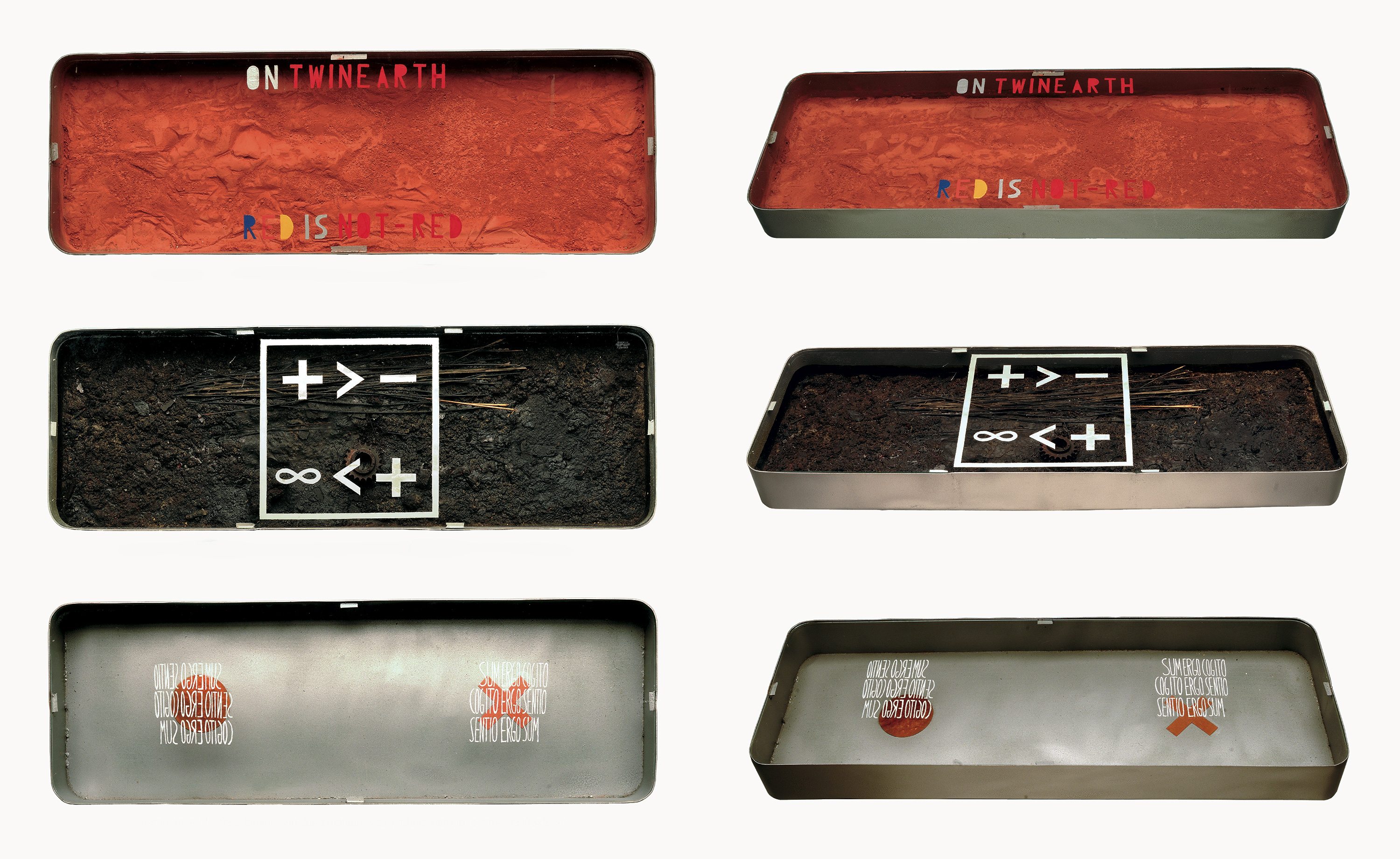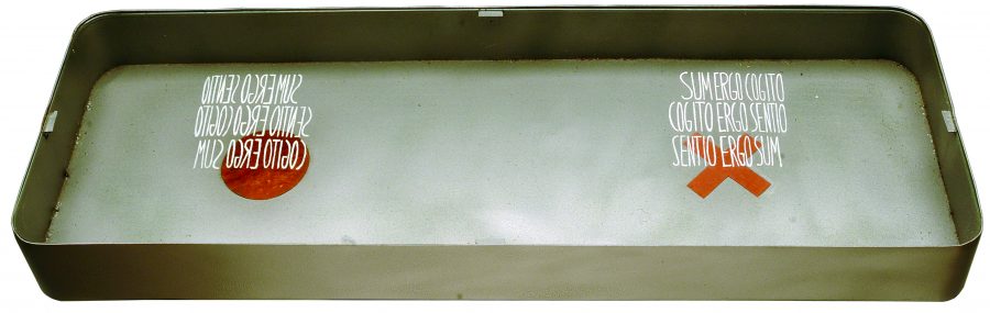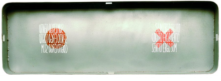 triptych, enamelled galvanised sheet metal, glass, writing, (I) red pigment, (II) tar, various materials, (III) copper, plaster