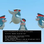 The left screen shows an NPC made of four dolphins wearing police hats. They rotate endlessly in mid-air. Through rhythm, formation, and repeated speech, they function as a moving disciplinary system. Rotation works both as visual motion and as a psychological adjustment. Rhythm reshapes the individual. Repetition reduces difference. Order appears natural and is framed as safety.