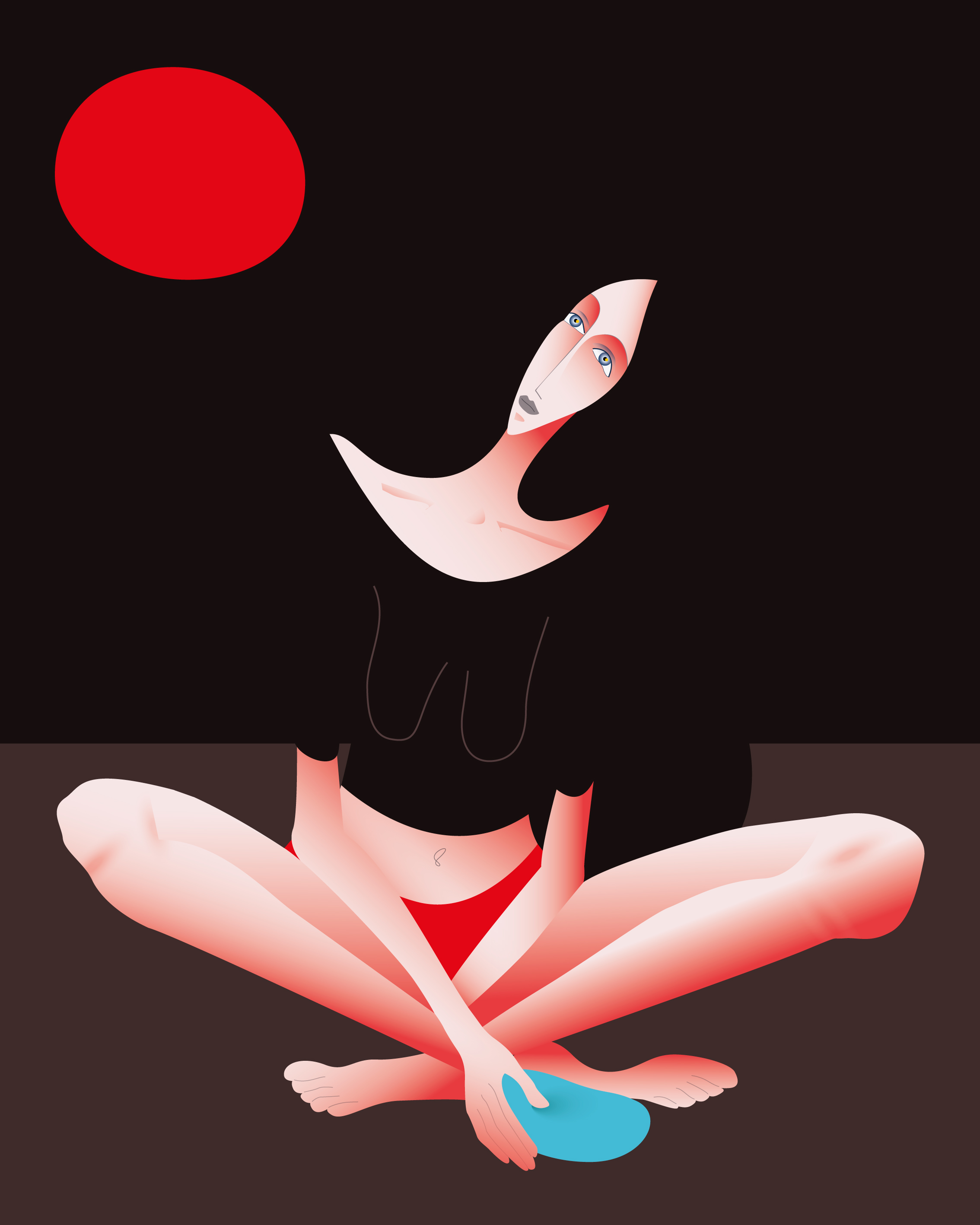 The figure is gathered in a simple gesture: she holds a stone and looks toward the moon. The contact with this natural element becomes a moment of quiet wonder. Her still, silent posture reveals an essential bond with something primal. The work captures an instant of listening, a moment of full, undistracted presence.