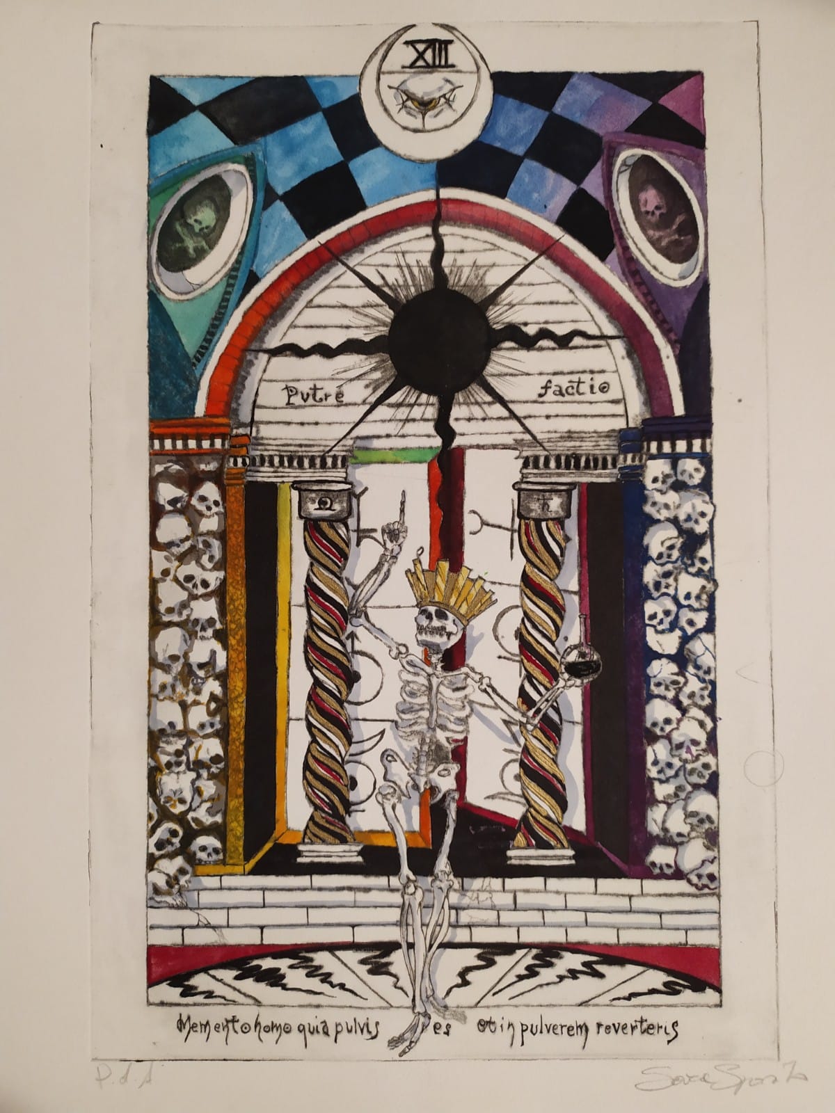 Hand-colored intaglio print — etching, aquatint, and drypoint on copper plate, enhanced with watercolor and colored pencils.