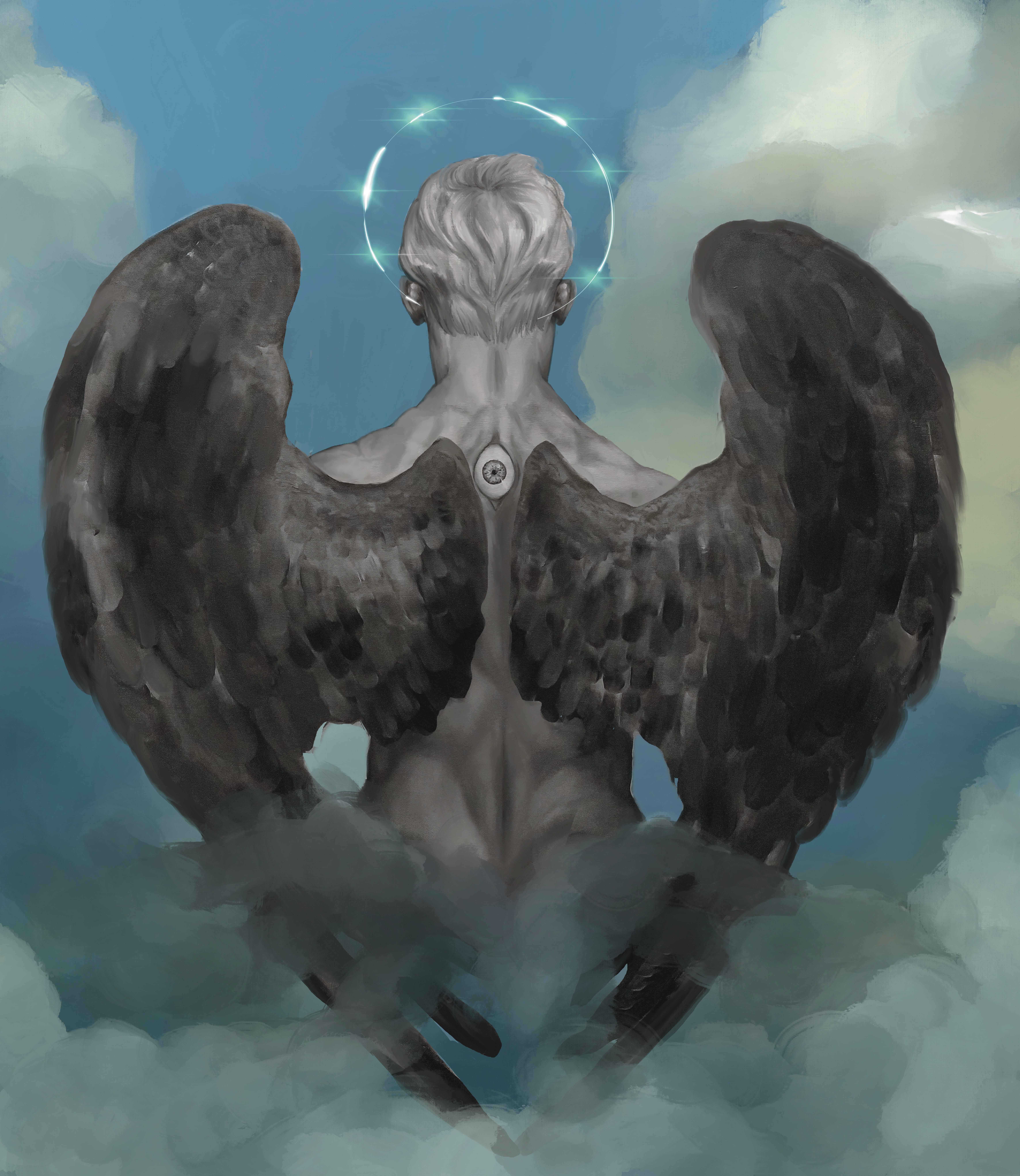 This painting is born as an oil on canvas and finds its completion on digital canvas. It depicts a guardian angel: he gazes ahead, yet one eye is fixed upon the viewer. He observes everything, seeing within and beyond both physical and spiritual space. His gaze transcends time.