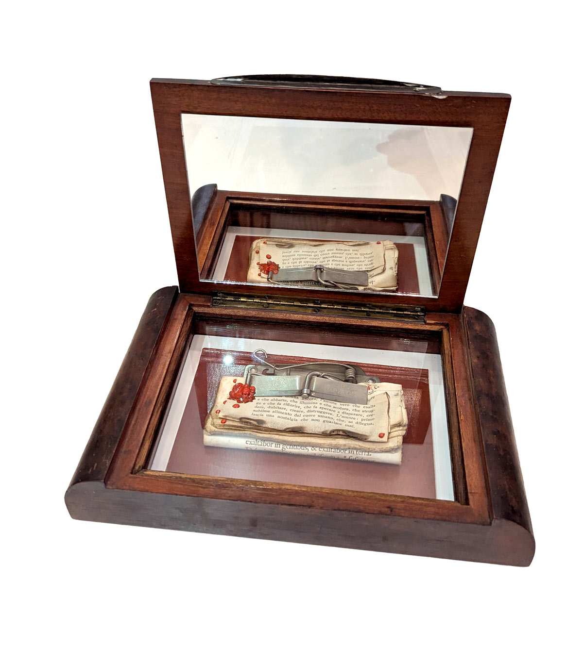 Cigar case from the 1940s, part of a folder from the 1920s-1930s, fragment of an old book with sealing wax dripping and mirror