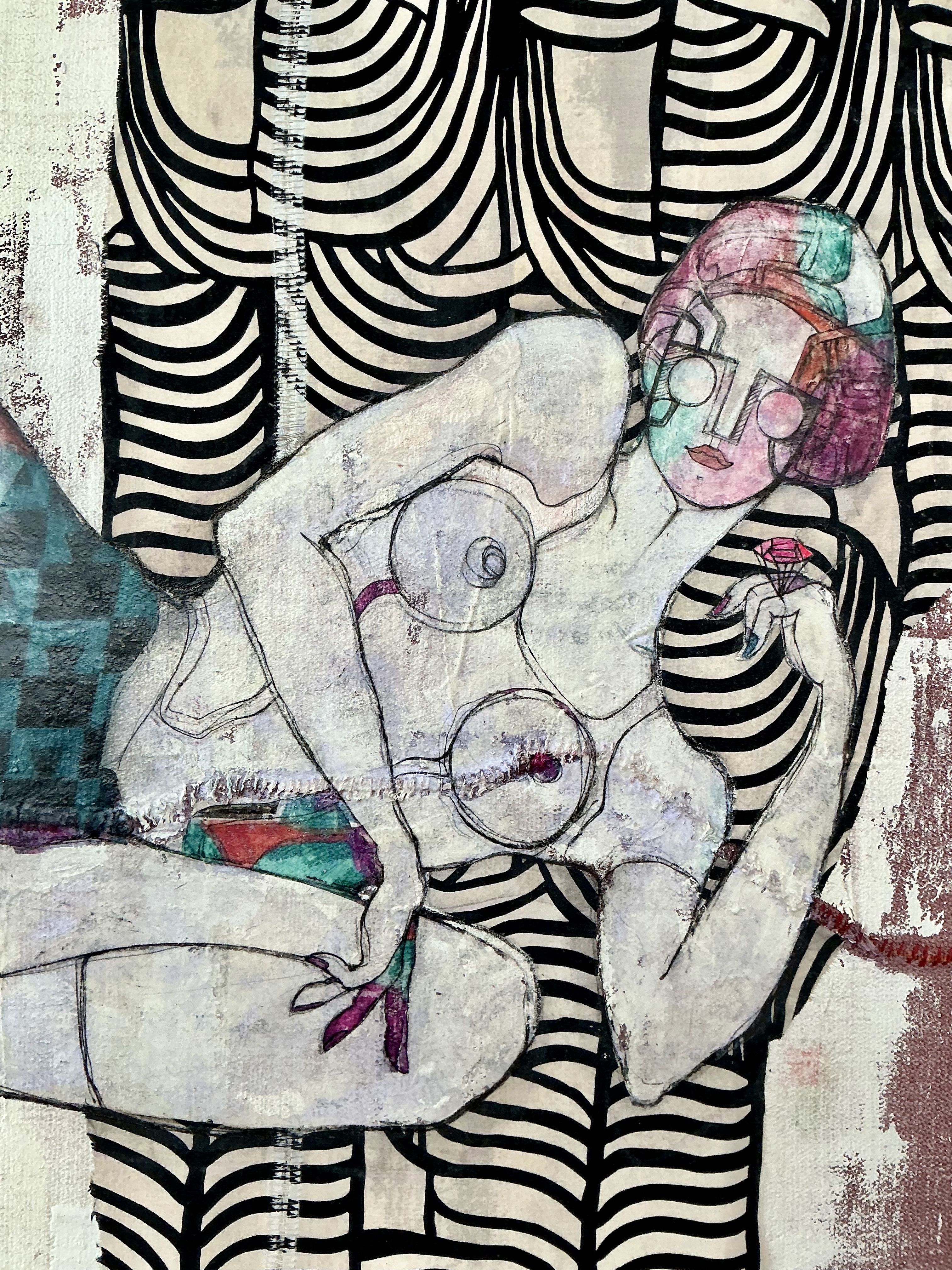 This specular contemplative figures with mask-like faces take shape as nude bodies, majolica-like tattoos, iron hairstyle, heels, and rings: symbols of an ongoing quest for identity and freedom. These figures exist in a state of transition, standing at the threshold of self-awareness, where the journey toward understanding and inner liberation begins.