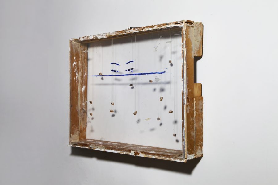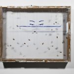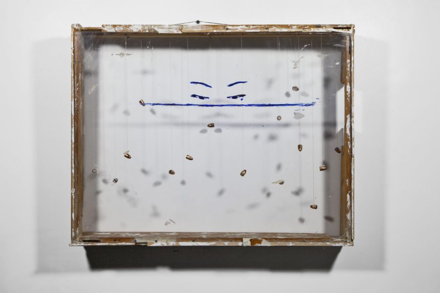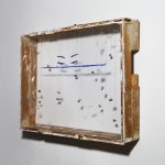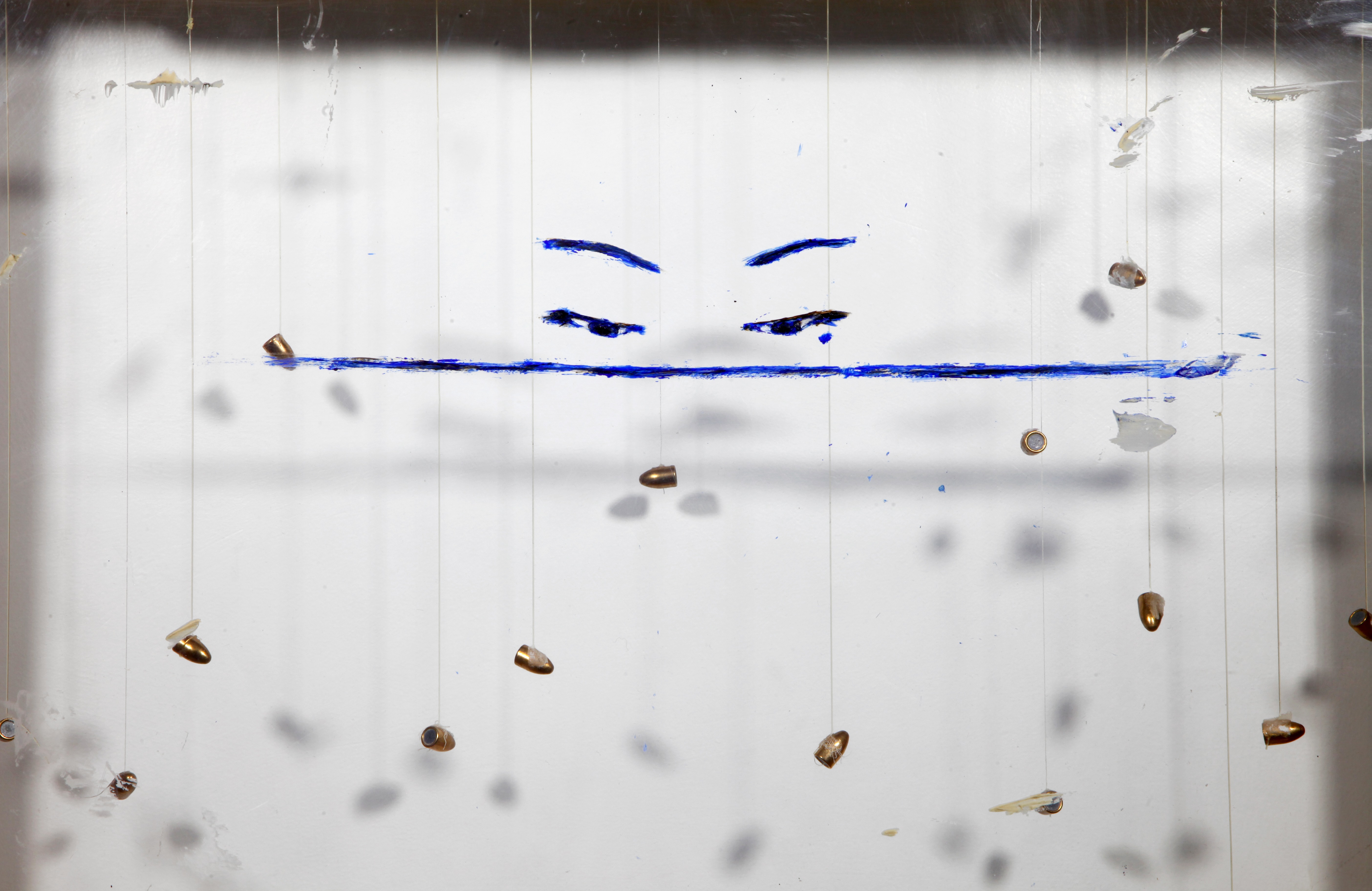 Unique work. Acrylic, marble dust, acrylic paste on plexiglass, wood, bullets, gauze, thread, nails.