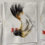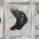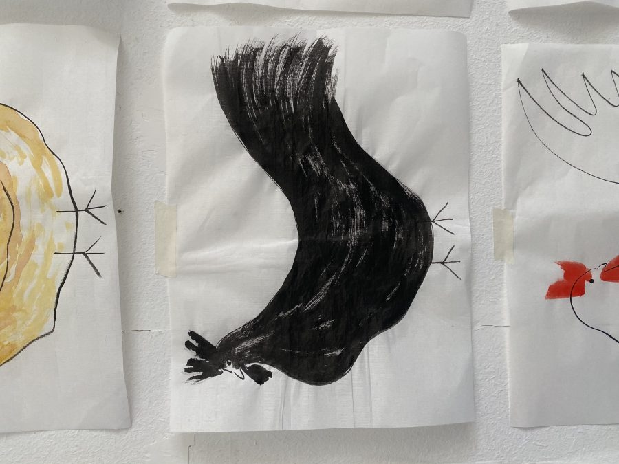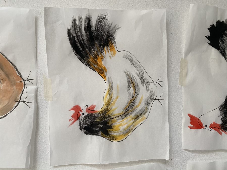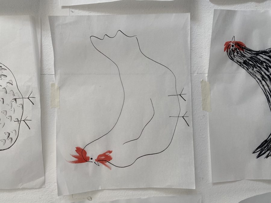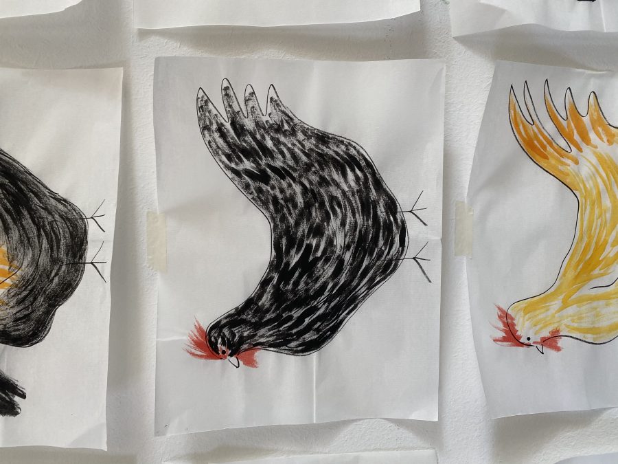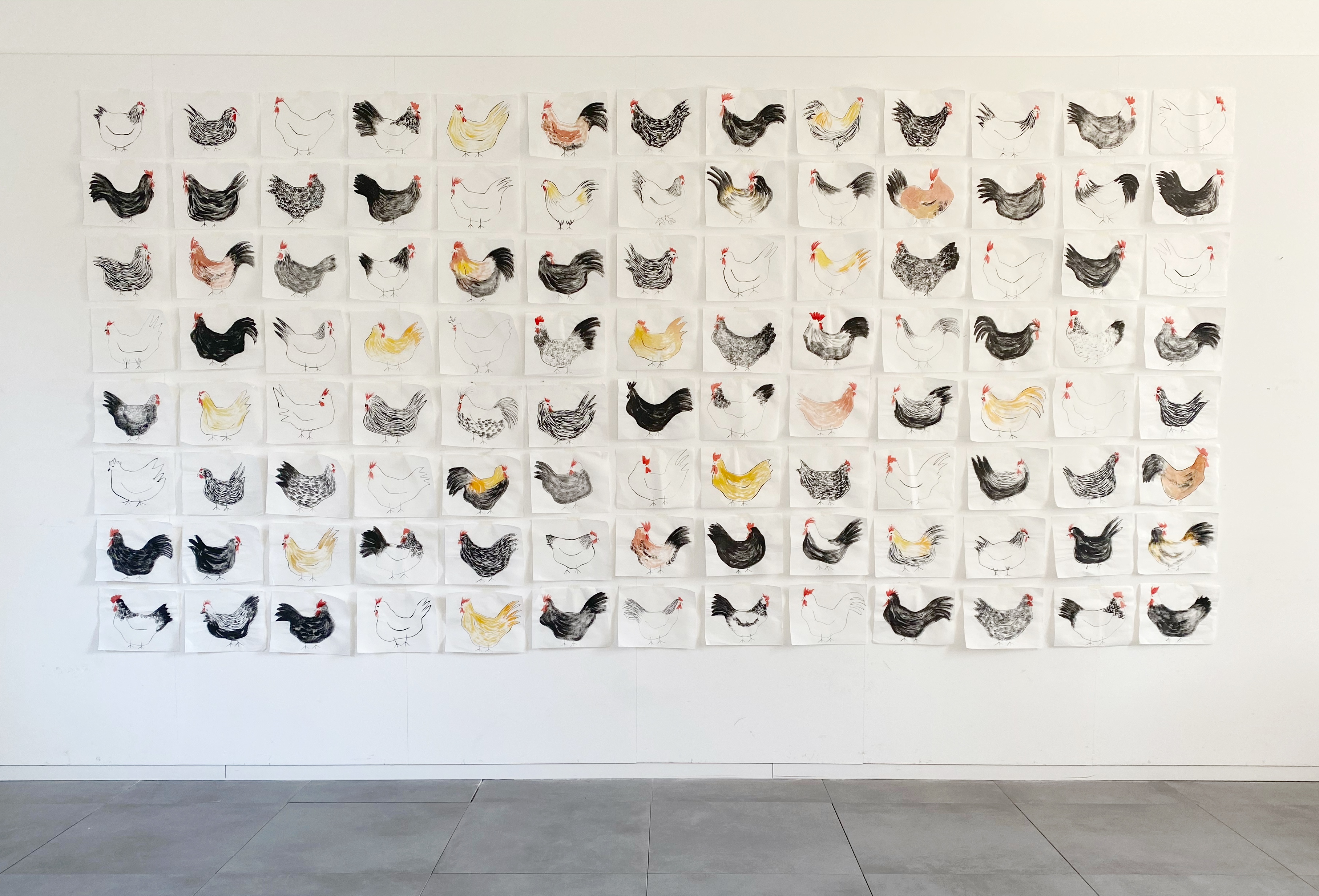 An intensive farm appears as a wall of silent gazes and similar bodies, yet never truly identical. The figures are traced one after another through a rapid yet focused gesture, evoking the logic of the assembly line and the automatism of repetitive labor. Each chicken retains a subtle individuality: a variation in color, a trembling line, a more pronounced brushstroke.