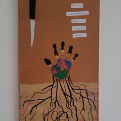 The installation is of variable sizes (sizes indicated for a space of 25 square meters). The materials used to make this work are only two: larch bark and essential oils of larch. The space in which the installation is exposed is bare of any furniture, since the work occupies the entire floor of the room. The bark, sprayed with essential oils of larch and arranged irregularly, create heaps of various heights: from a minimum of 4 cm to a maximum of about 100 cm.
