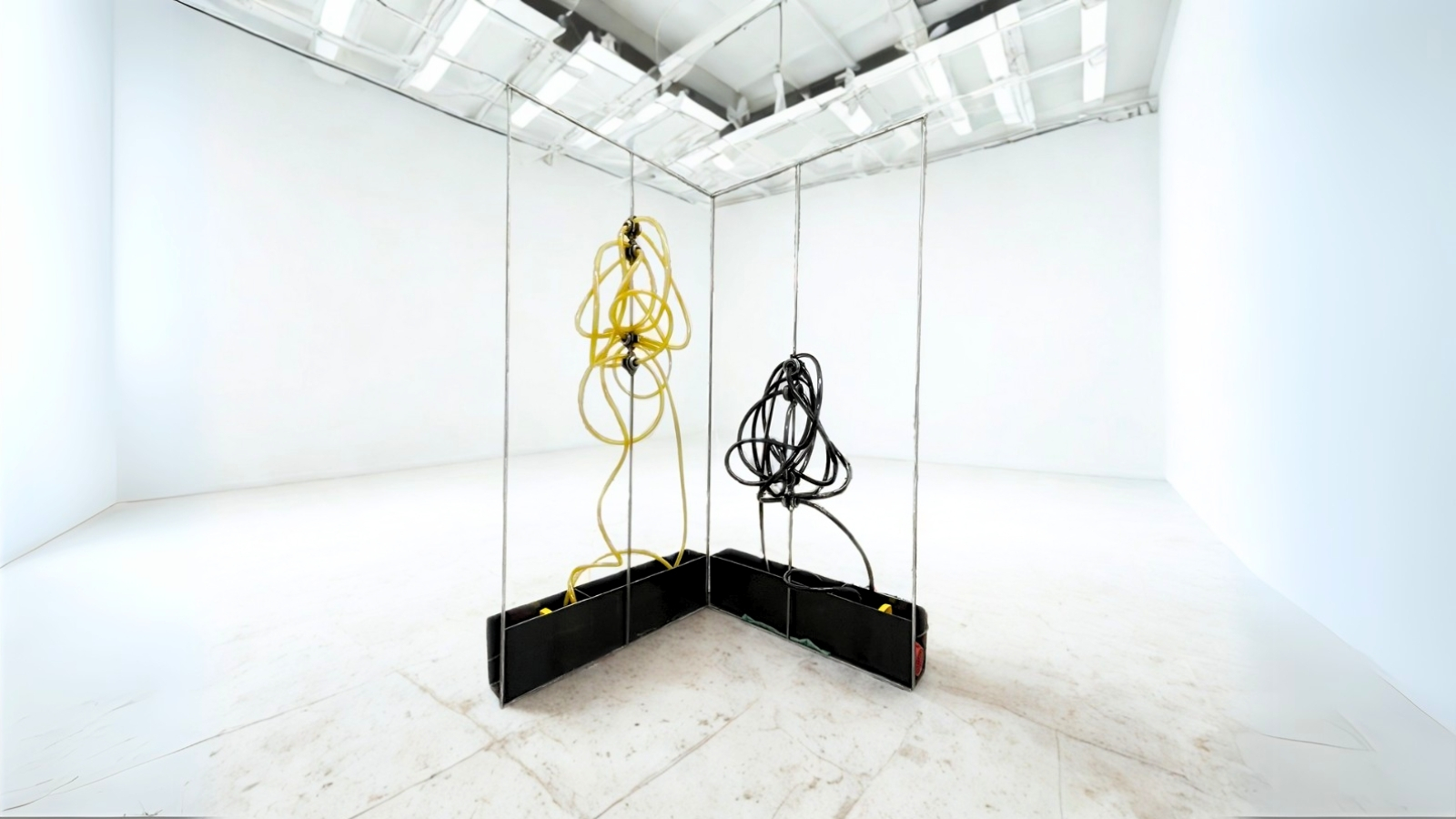Kinetic and sound installation. Mixed media using iron, silicone tubing, oil-based liquid, industrial electric pumps, relay timers, and automotive mechanical components. Unique work. Iron support.