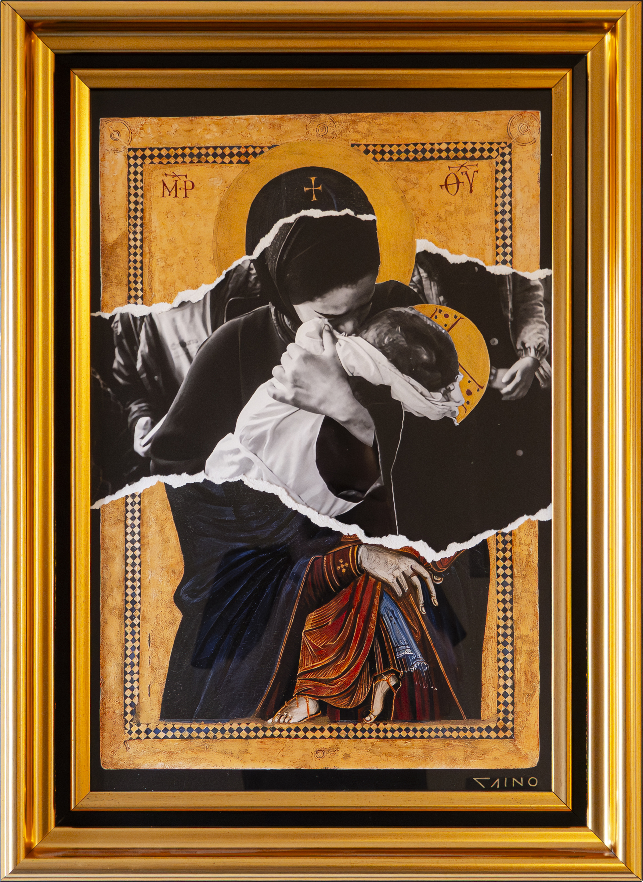 Mixed media: décollage on Fine Art print (Hahnemühle Photo Rag 308 gsm) with painterly interventions, unique piece, Fine Art paper mounted and framed.