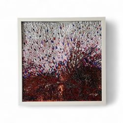 The work is done by grinding a domestic carpet with a kitchen knife. The original object dissolves with a process, contrary to what had created it. The care, the dedication, the ability of manual skills of the craftsmanship coincide and overlap the artistic gesture. The floor becomes a receptor for the volatile remains of the carpet, which, although dispersed, still catalyzes the integrity of the original shape now lost.