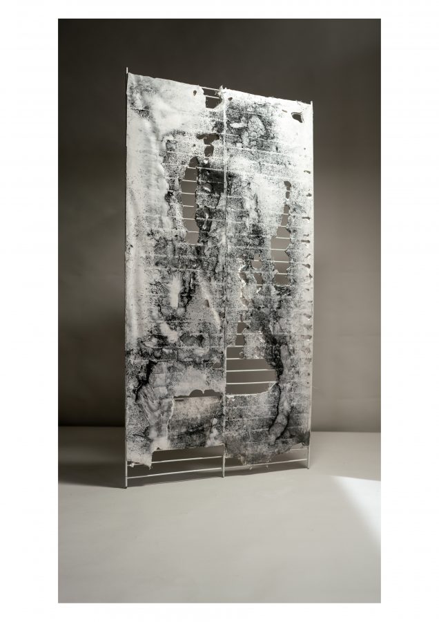 work Wall Displacement category Sculpture subject Abstract tags base 40 cm height 80 cm depth 0 cm year 2024 Plastic coated grid, plaster, pigments 0 likes 0 comments