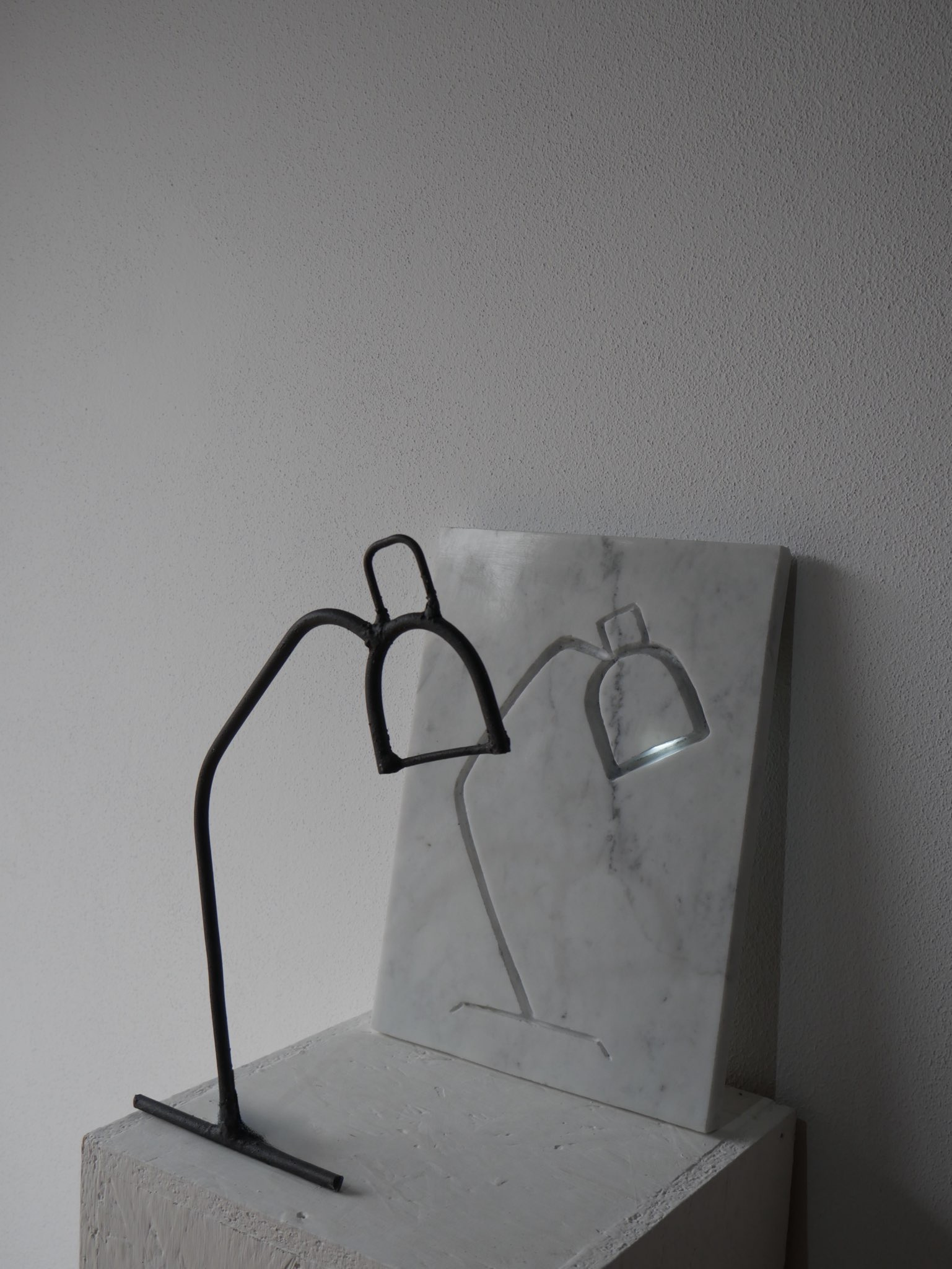 Marmo inciso, luce a pila e tondino di ferro saldato