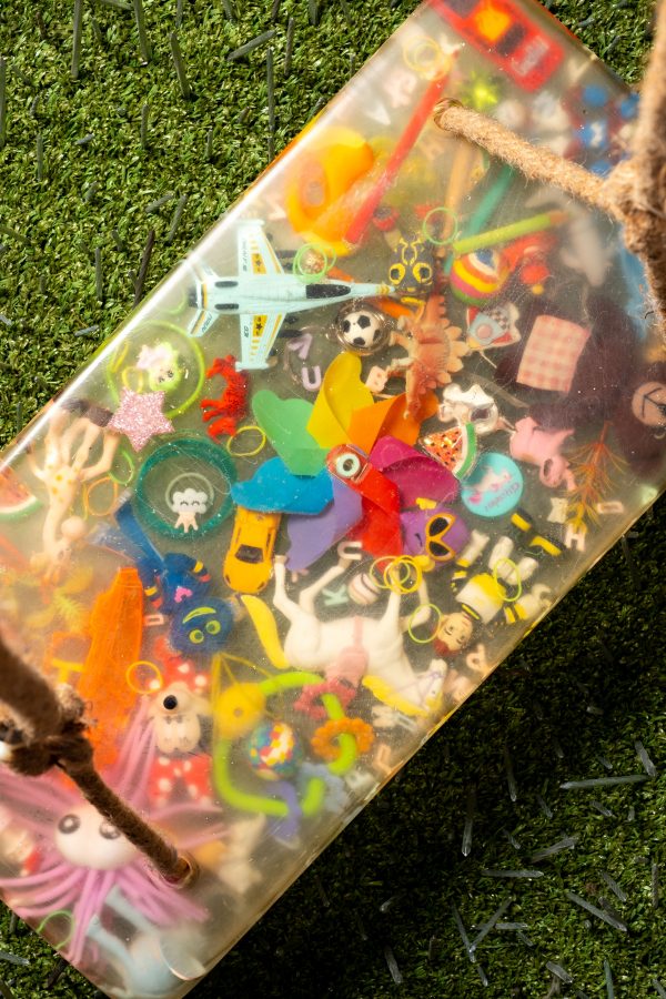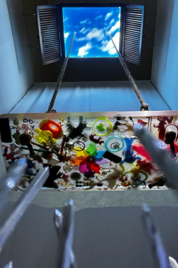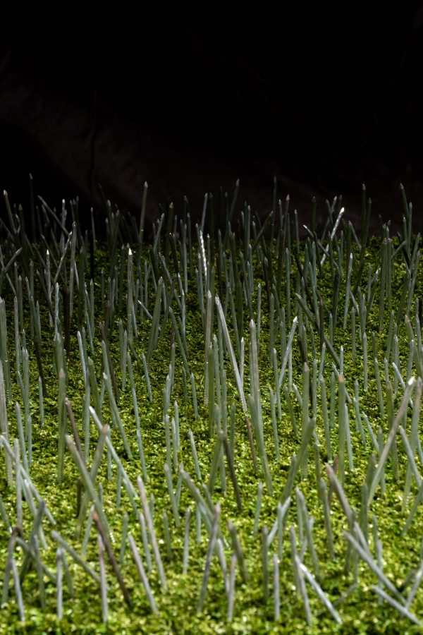 Tecnica mista, materiali: chiodi, erba sintetica, corda, resina, plastica, legno, plexiglass, led