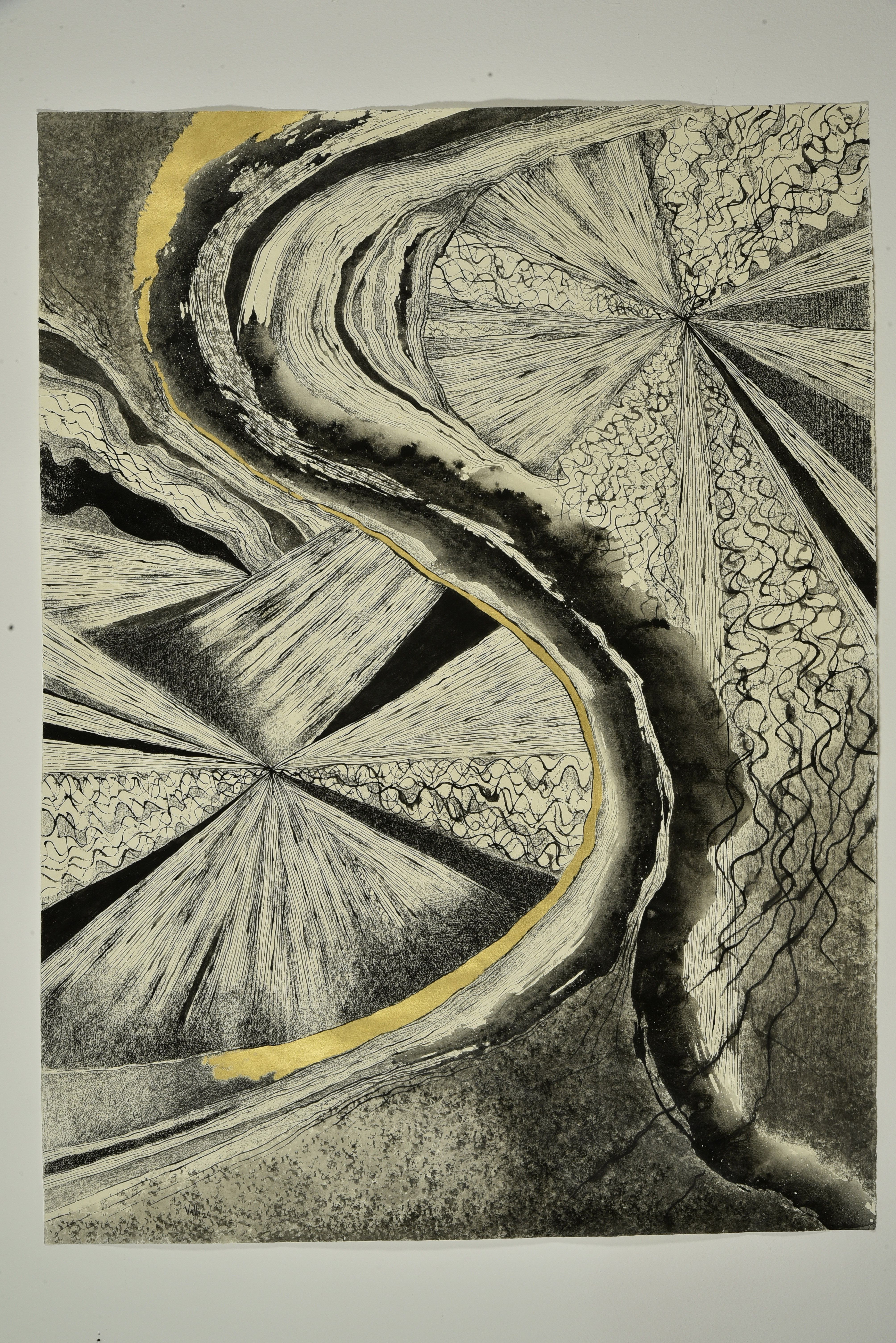 in questa tecnica mista è presente, oltre alla tempera all'uovo, matite, matite grasse, grafite, grafite acquerellabile, l'oro a decalco 22 K. Continua in questo lavoro la ricerca del Segno come ciò che dà indizio di altra realtà.