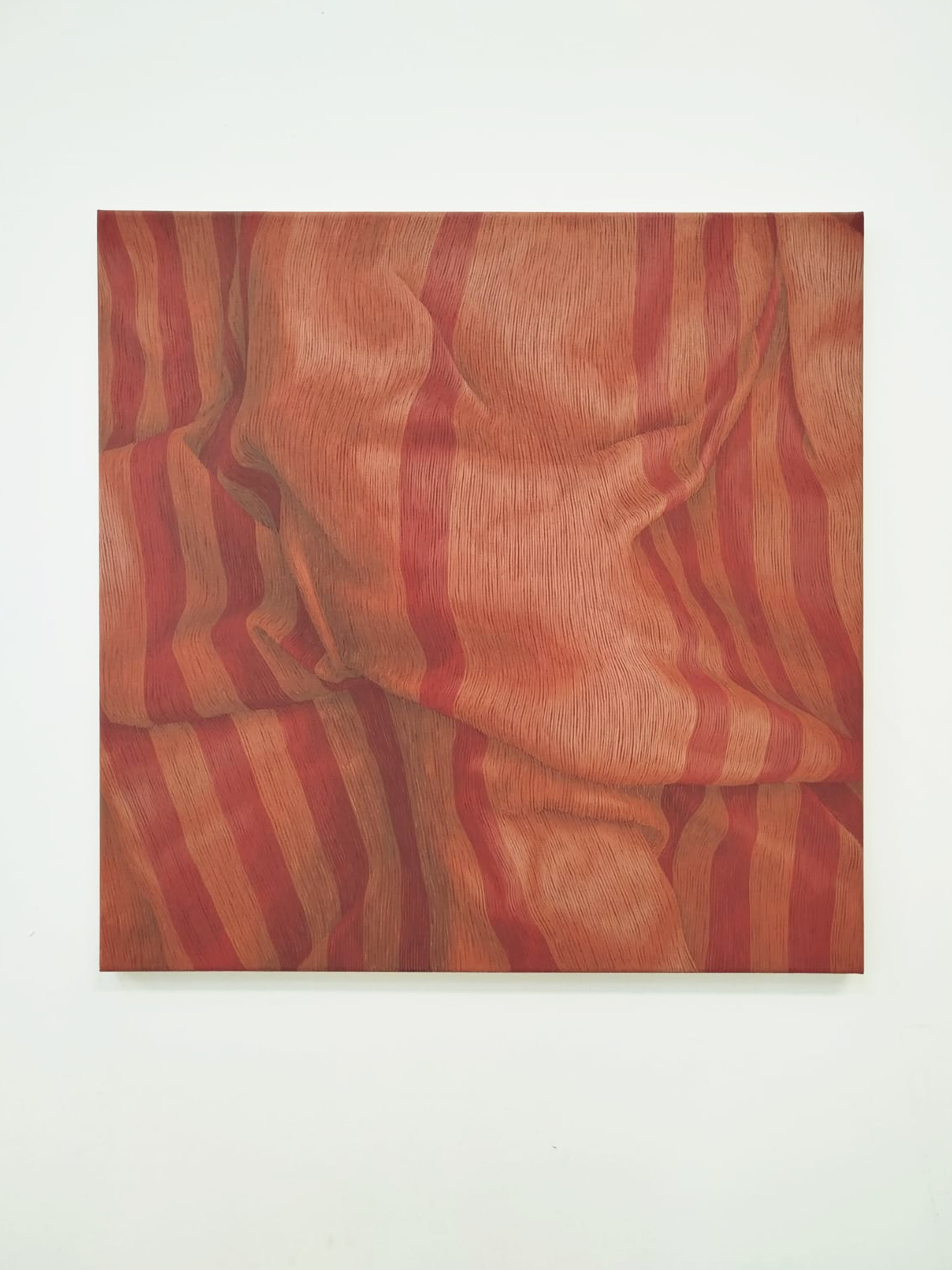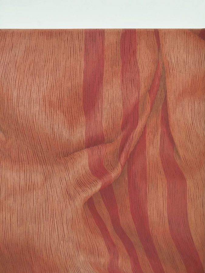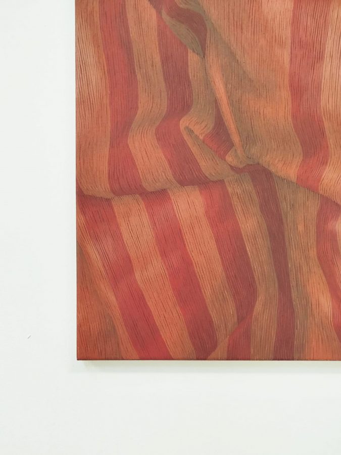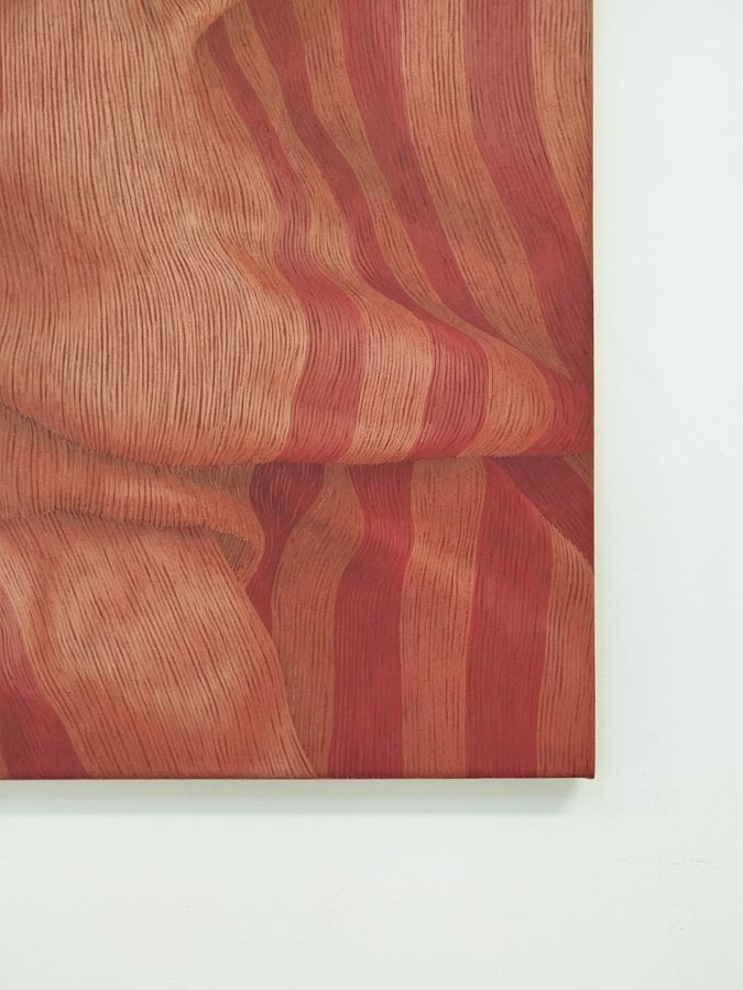 Il progetto “Corpo tessuto” indaga attraverso la pittura l’assenza e la provenienza di un corpo migrante, in continuo spostamento, per cause geopolitiche; un corpo ritrovato che nella drammaturgia contemporanea è solitamente ritratto dai medium di massa, come coperto, nascosto, celato da teli asettici e anonimi. Ecco che lo studio formale sui motivi decorativi dei tessuti dipinti, assume la valenza di statuto genetico di provenienza del corpo assente; ogni intreccio è un dna che diviene presenza concreta solamente attraverso il silenzio della pittura.