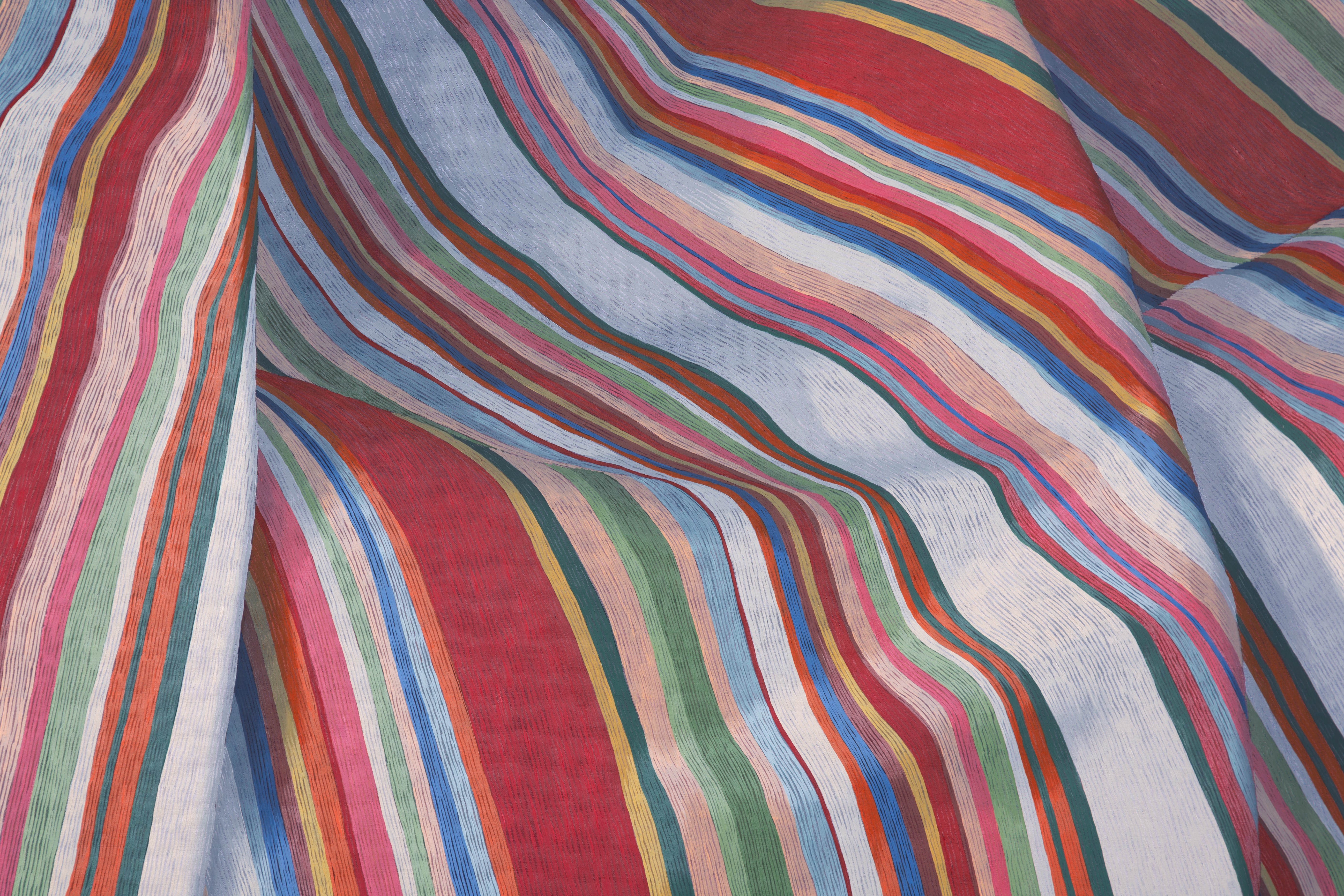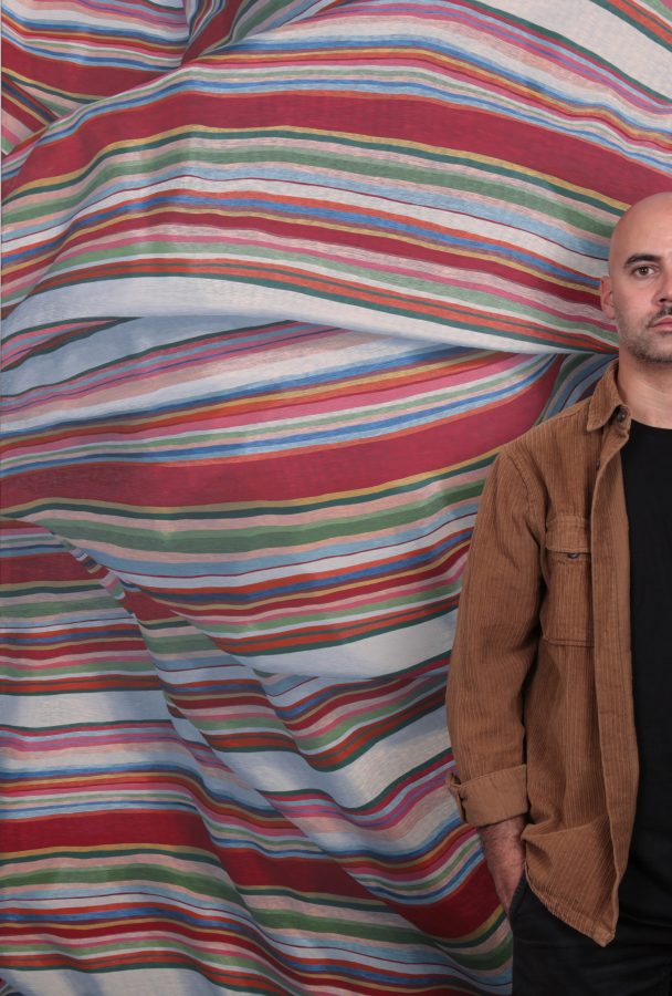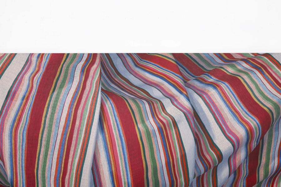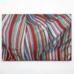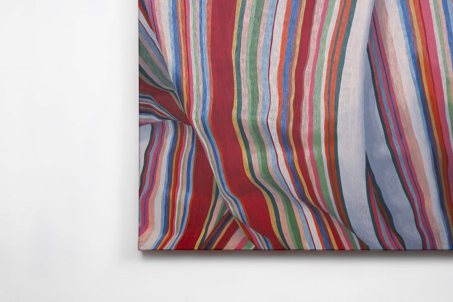 Il progetto “Corpo tessuto” indaga attraverso la pittura l’assenza e la provenienza di un corpo migrante, in continuo spostamento, per cause geopolitiche; un corpo ritrovato che nella drammaturgia contemporanea è solitamente ritratto dai medium di massa, come coperto, nascosto, celato da teli asettici e anonimi. Ecco che lo studio formale sui motivi decorativi dei tessuti dipinti, assume la valenza di statuto genetico di provenienza del corpo assente; ogni intreccio è un dna che diviene presenza concreta solamente attraverso il silenzio della pittura.
