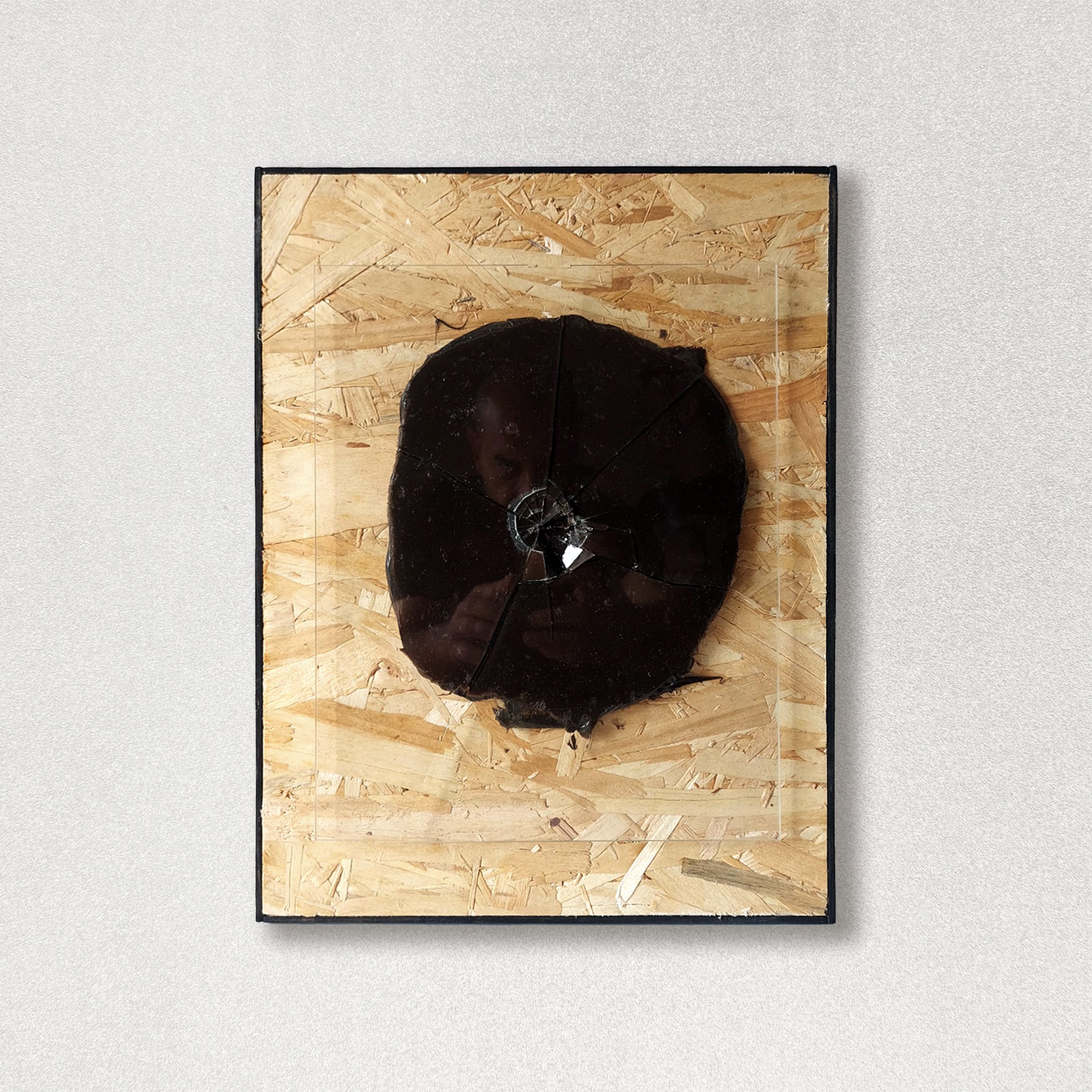 L'opera è la testimonianza visiva di un accadimento irrevocabile. Una forza invisibile colpisce il presente, lo deforma e lo sigilla. Ciò che accade in un solo istante può sedimentarsi per sempre nella materia, trasformandola in archivio silenzioso del tempo interiore. Silicone, vetro e pigmento su OSB. Pezzo unico