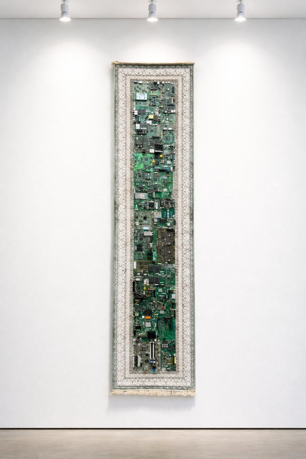 Materiali: circuiti elettronici, componenti industriali, supporto tessile - tappeto persiano
