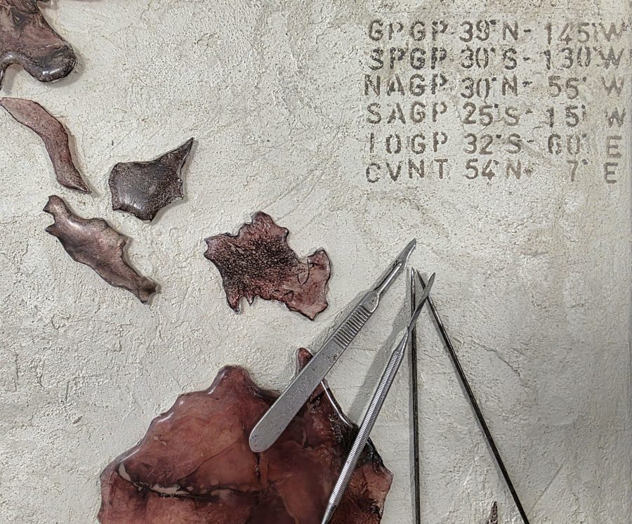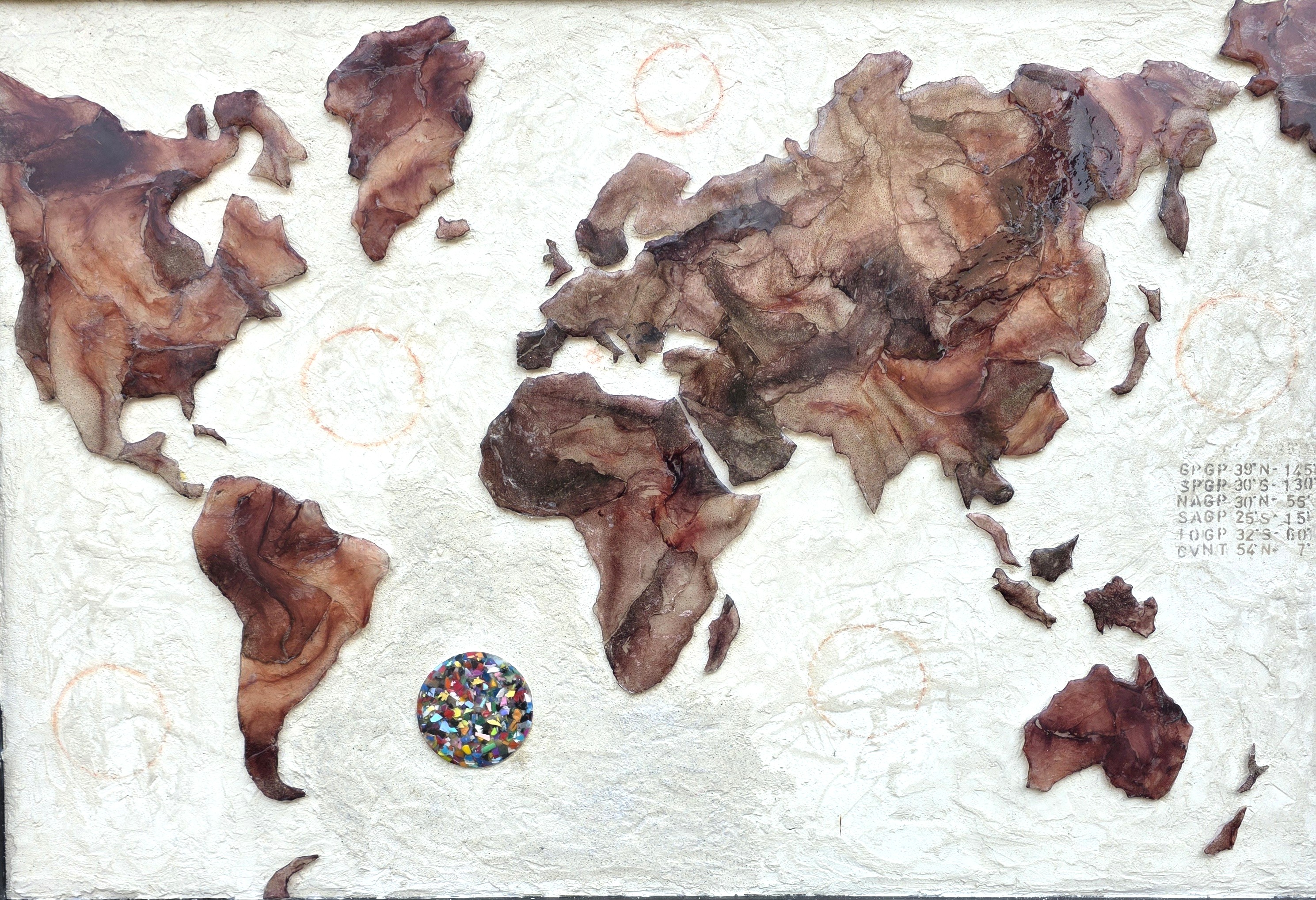 Quest’opera affronta il fenomeno delle cosiddette isole di plastica, immensi vortici oceanici in cui le correnti concentrano milioni di frammenti di rifiuti. Non terre emerse, ma continenti invisibili fatti di microplastiche, reti e scarti, diffusi in cinque grandi aree degli oceani del pianeta. La plastica, proveniente in gran parte dalla terraferma, non scompare: si frammenta, entra negli ecosistemi marini e nella catena alimentare, trasformando il mare in un archivio tossico delle nostre abitudini. L’opera invita a riflettere su un paesaggio globale creato dall’uomo, dove il confine tra natura e rifiuto si dissolve.