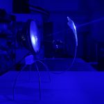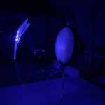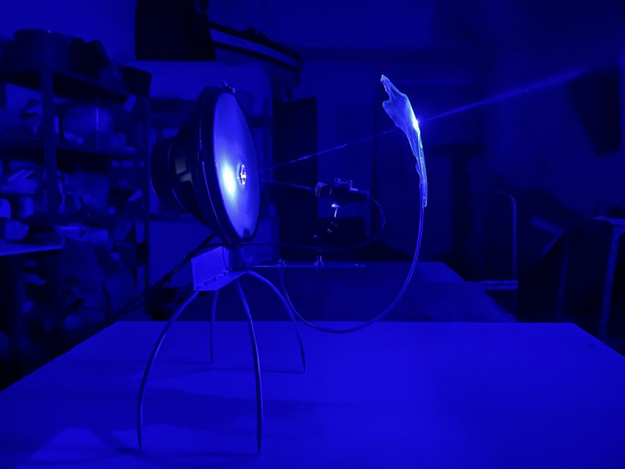 Installazione sonora e luminosa. Tecnica mista con ferro, altoparlante full-range, lattice, frammento riflettente, resina, modulo laser 405 nm, amplificatore e sensore. Opera unica. supporto in ferro.