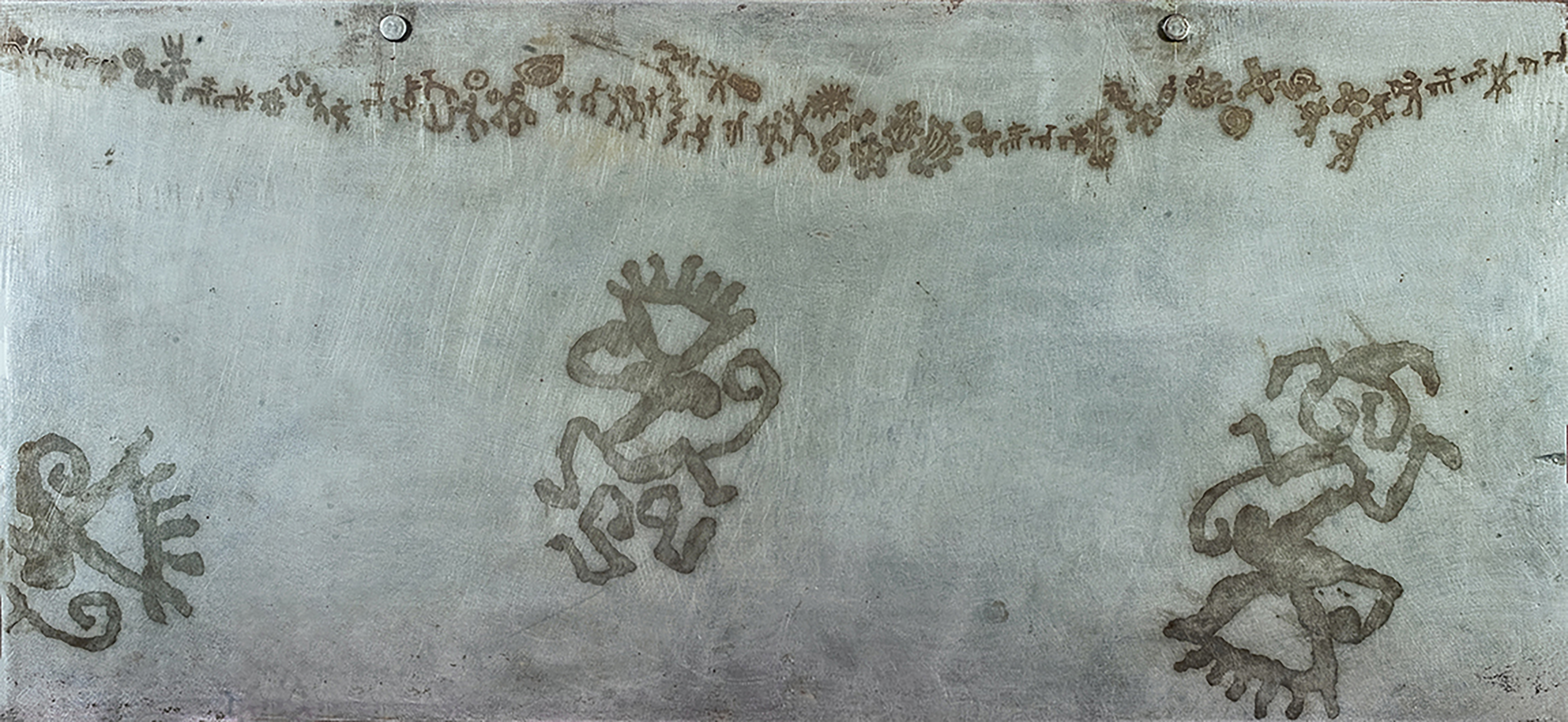 Questa lastra metallica, apparentemente fredda e industriale, si trasforma in un archivio ancestrale, un palinsesto del tempo inciso con segni arcaici e figure danzanti. Le tracce incise non sono semplici decorazioni: sono memorie fossilizzate, sopravvivenze di gesti e linguaggi dimenticati che riaffiorano sulla superficie come eco di un passato remoto.