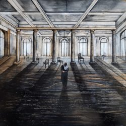 Installazione composta da rami bianchi e fili rossi, sospesa all'interno di una chiesa abbandonata.