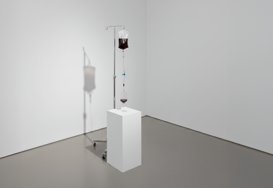 vino rosso (Merlot o Aglianico), gruccia in acciaio per sacche ematiche, sacca ematica, tubo in plastica per iniezione endovenosa, valvola in plastica di regolazione del flusso ematico, ago per iniezione endovenosa, calice da degustazione in vetro, piedistallo in legno verniciato.