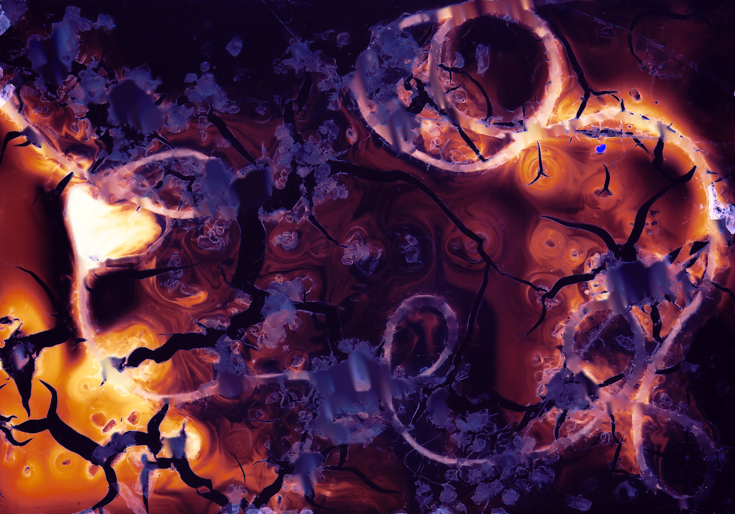 Tecnica: mista su micro-frammenti organici e inorganici, fissati su rettangoli di acetato montati su telai per diapositive da 24×36 mm e successivamente post digitalizzati.