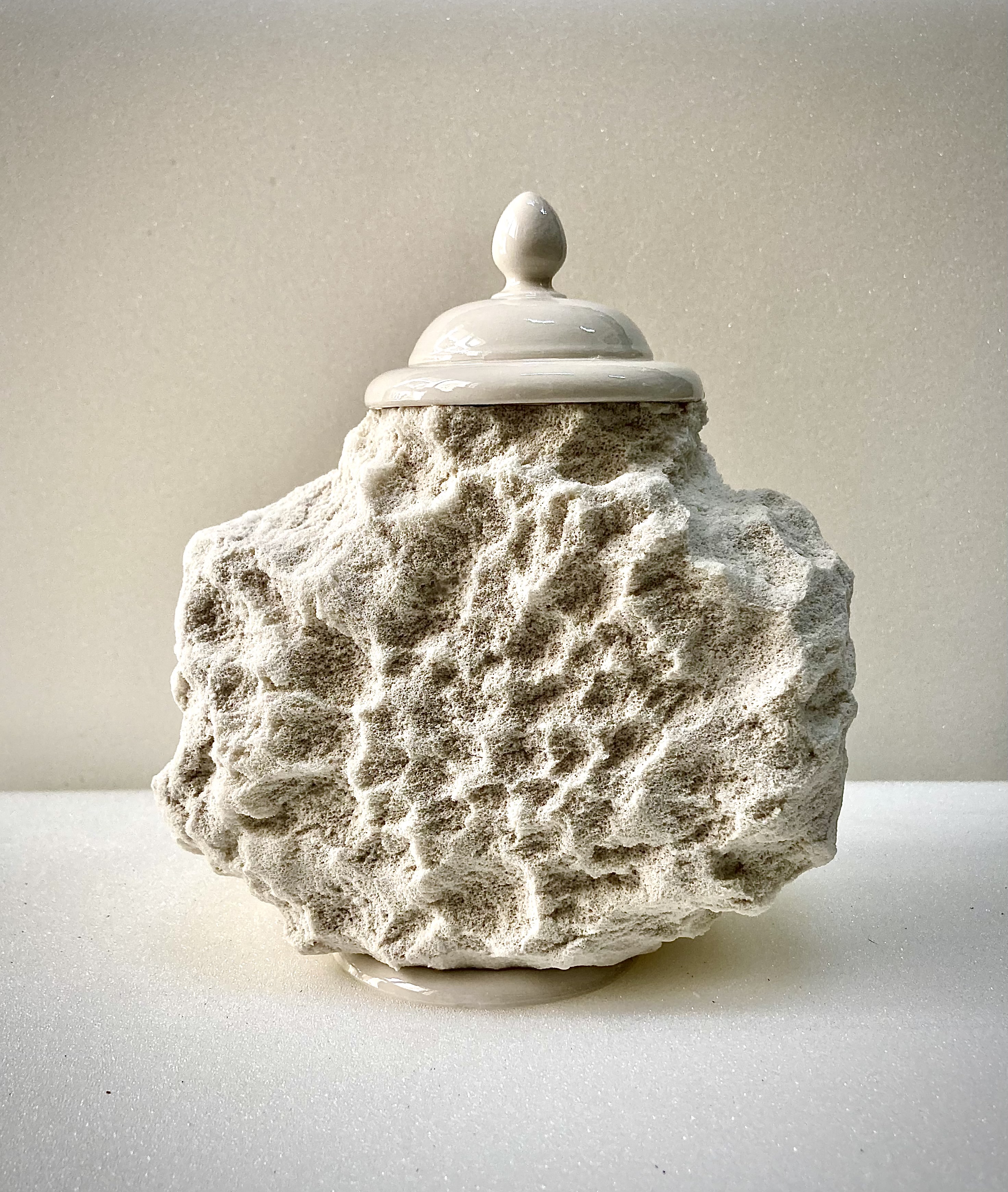 sovrapposizione di un bel coperchio cesellato a un grumo magmatico di porcellana, quasi una