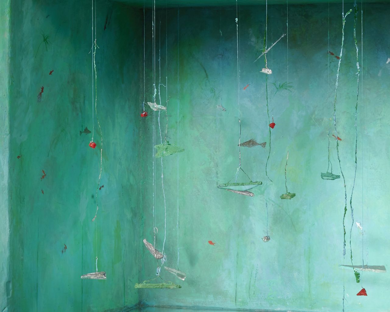 tecnica mista, opera unica, acrilico, acquerello, gesso e paste acriliche su polistirene e polistirolo, filo