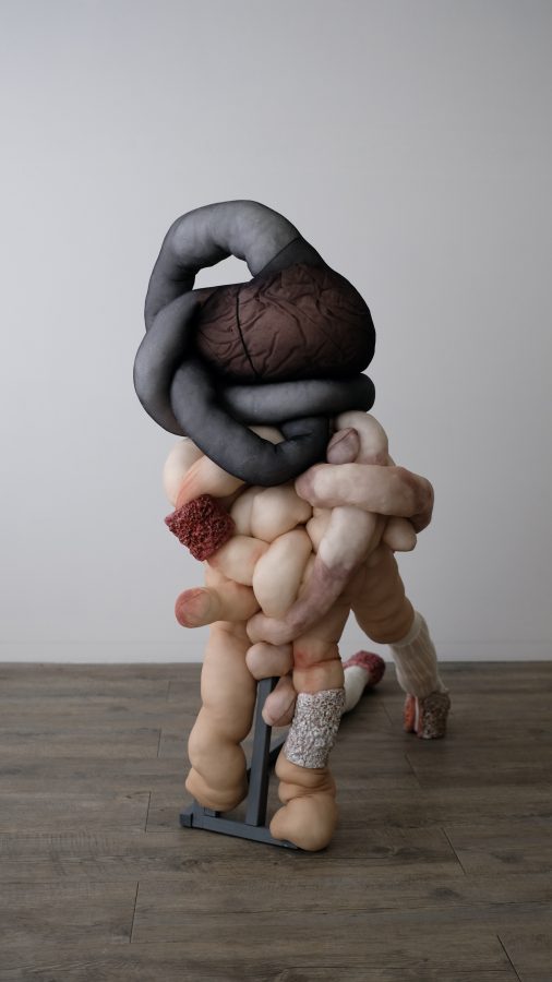 Il nostro corpo, infatti abita il mondo ed è in continua relazione con esso: reagisce agli stimoli che ne provengono e – come una superficie di scrittura – ne conserva tracce dell’interazione, cicatrici indelebili, segni che ne fanno una memoria viva. Ma esso è anche limite, argine, contenitore; spazio interiore ed esteriore di cui la pelle costituisce il confine definitivo tra l’uno e l’altro. E se ci togliessimo tutti la pelle di dosso? Cosa rimarrebbe? – si interroga l’artista. Potremmo osservare cosa vi entra, come penetra fino alla profondità delle viscere, come viene trasformato, come nutre la macchina complessa e il suo funzionamento. Il corpo è nell’opera di Marinoni il punto di partenza di qualsiasi riflessione: il vuoto, le ferite, la cura, la memoria e, infine, il senso stesso dell’esistenza.