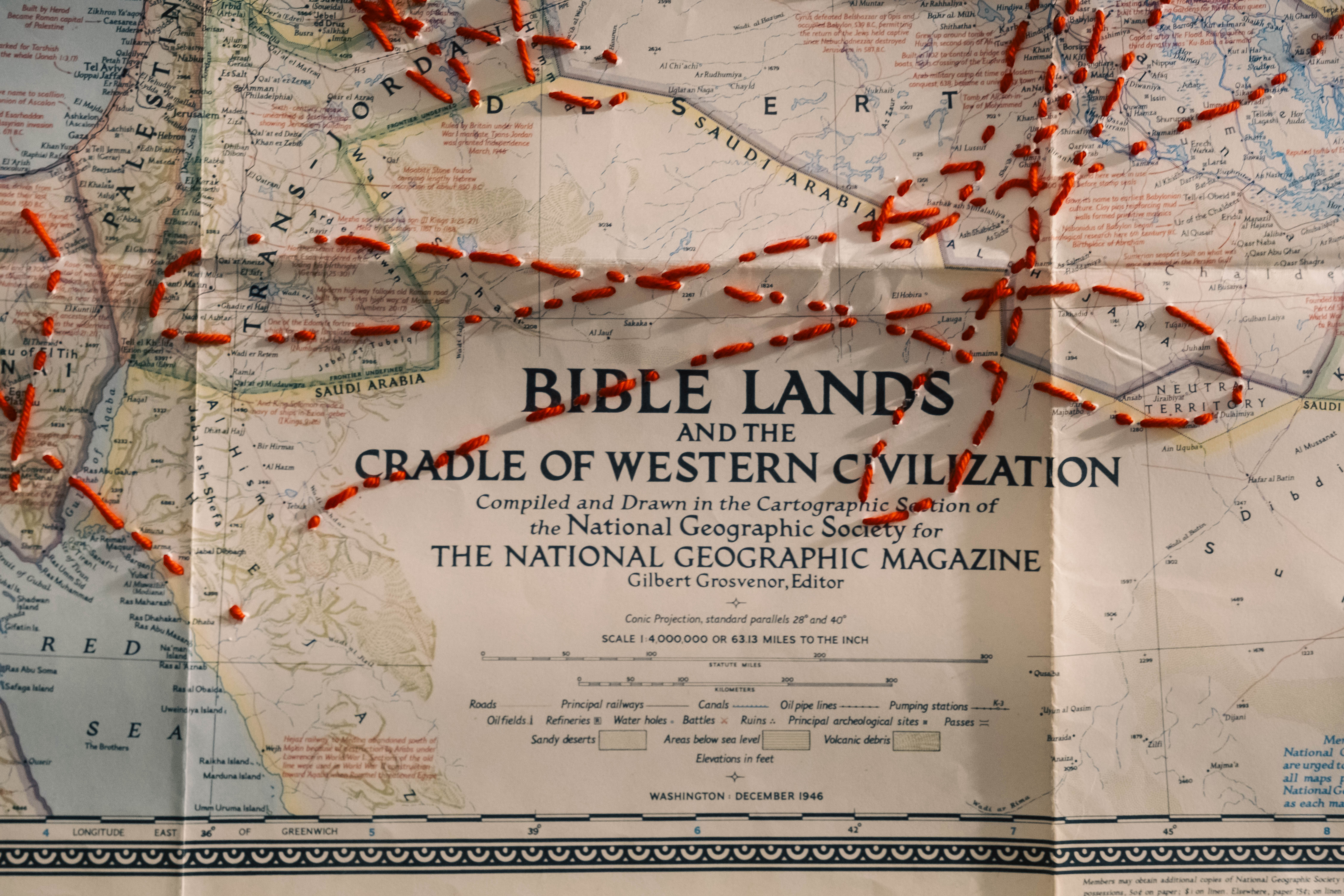 Ricamo in codice Morse su mappa geografica del National Geographic "Bible Lands" 1946