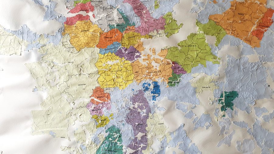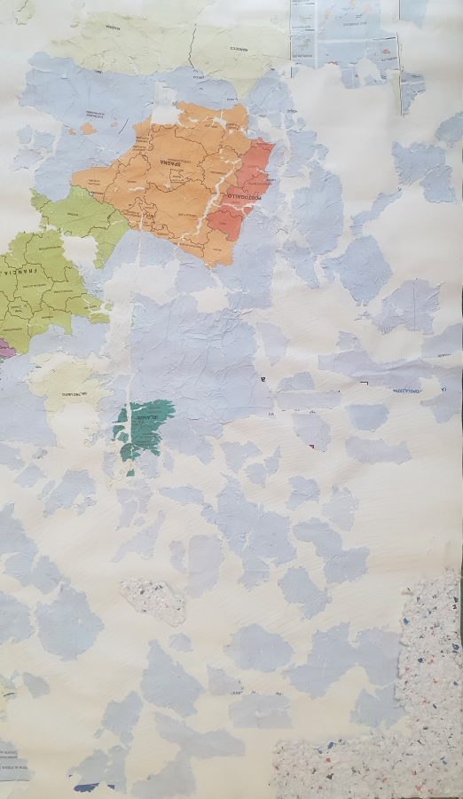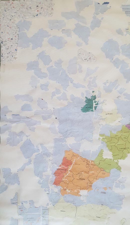 Ho trovato una carta geografica accartocciata nel bidone della carta, l'ho sciolta nell'acqua e poi ricomposta. Tutti i pezzi rimasti nell'acqua sono stati pressati e hanno composto nuove isole. Nei grandi vuoti è stata usata la tecnica del rigatino per ricomporre il disegno.