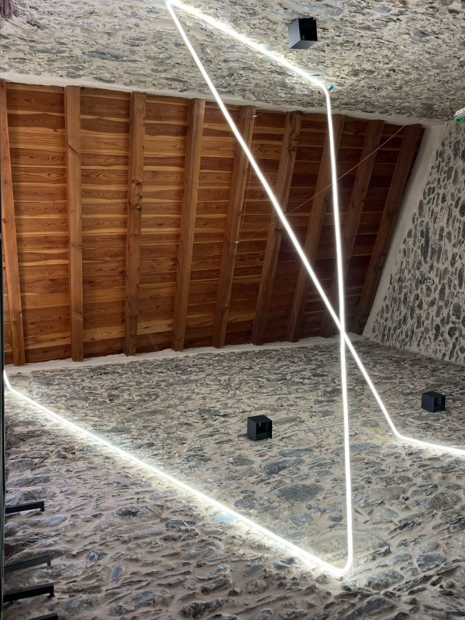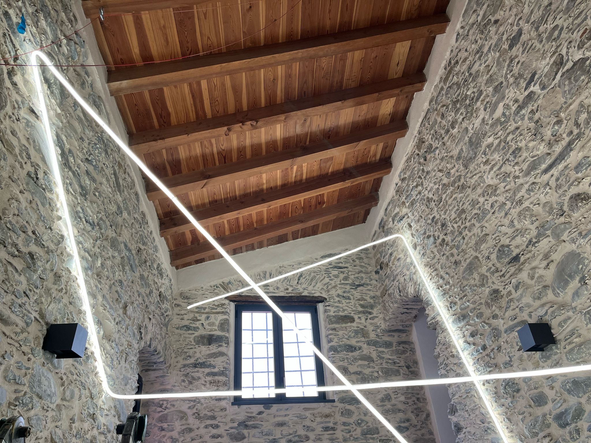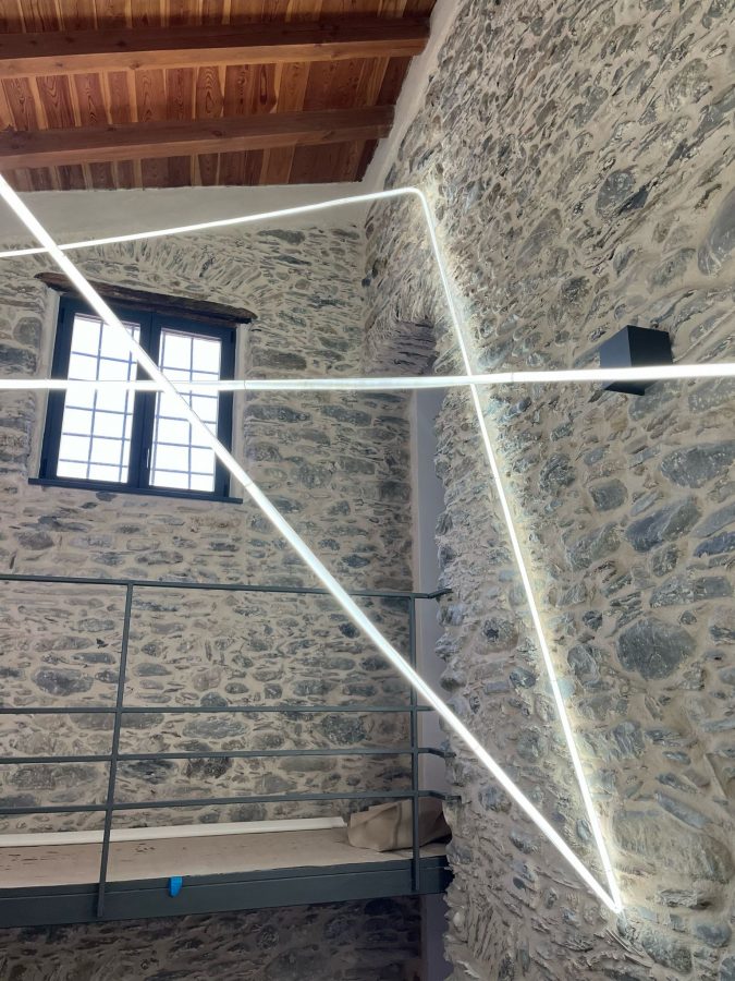 “Lumen” , realizzata in led neon 360 gradi installata in un’antica dimora trasformata in Residenza artistica a Pieve di Teco (IM) è il segno che, emergendo dal buio, fluttua in direzioni non determinabili invitando a un viaggio sospeso nel tempo. “Aprire un sipario significa qui svelare la luce, simbolo da sempre di vita e conoscenza, in tutta la sua potenzialità: svelando il reale ma soprattutto il non visibile, l’opera invita ad un viaggio di sentimenti contrastanti, dalla sorpresa all’inquietudine, alla serenità dell’abbandono in un luogo sospeso”.