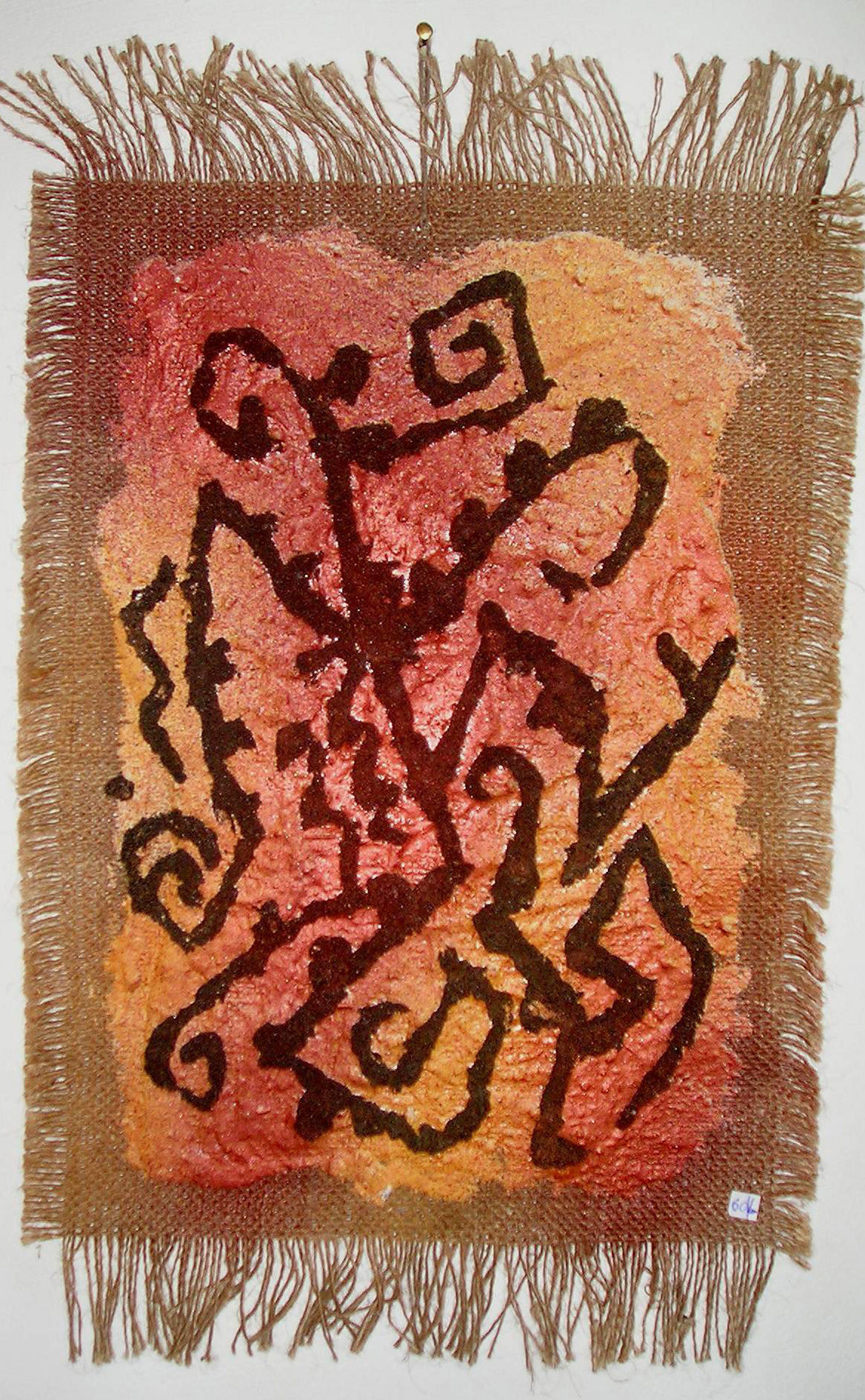 Figura antropomorfa su iuta. Tecnica mista in gesso e acrilico con disegni in rilevo in polvere di metallo.