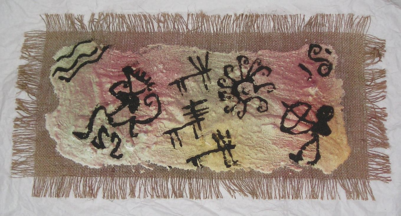 Tecnica mista su iuta e gesso, aerografo, acrilico, polvere di metallo per immagini a rilievo