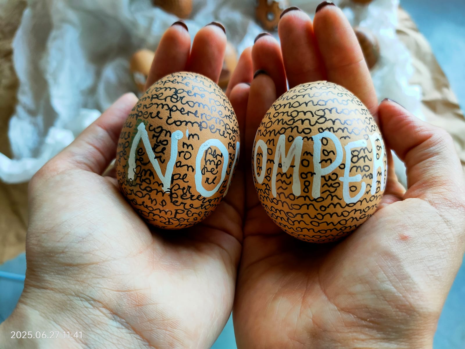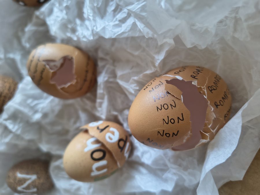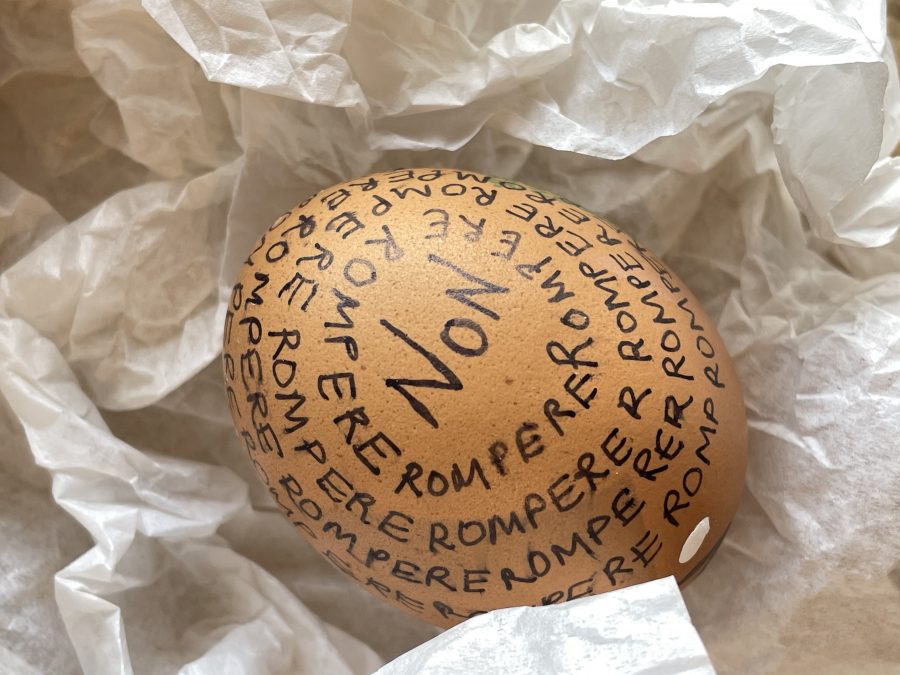 Per rappresentare tutto ciò, ho scelto di scrivere le parole "non rompere" su diverse uova. Le uova simboleggiano la fragilità ed evocano l’espressione "camminare sulle uova", metafora perfetta di una tensione e di un’incertezza costanti.