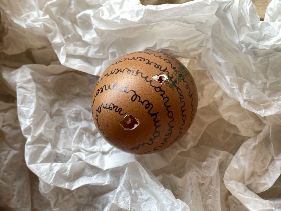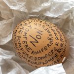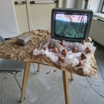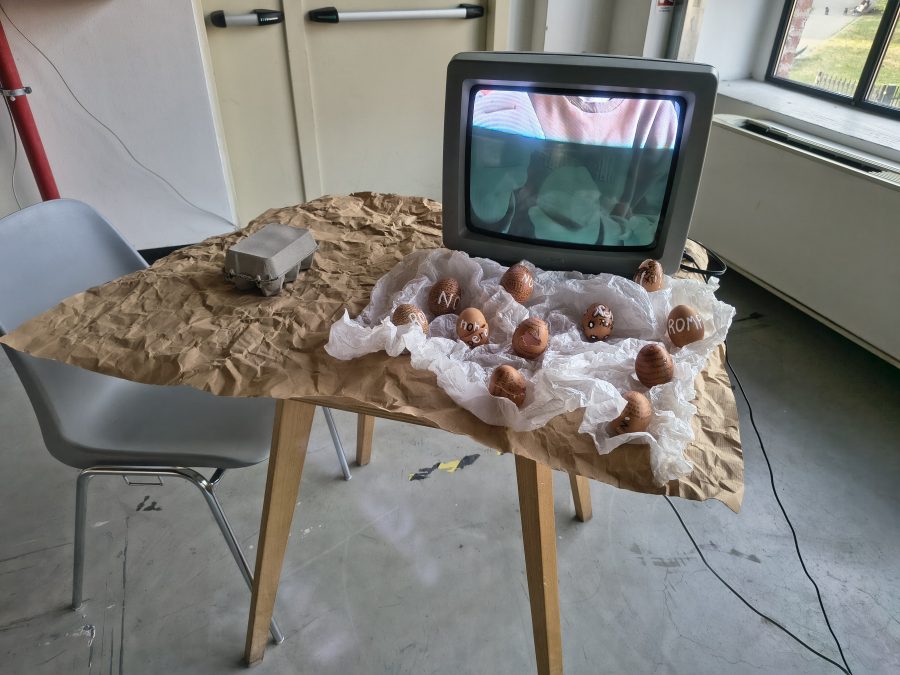 Il video mi ritrae mentre scrivo sulle uova a bordo di un treno, un gesto che contrappone la mia staticità e il mio focus interiore al movimento inarrestabile del mondo circostante. Le uova vengono poi esposte come monito su ciò che non si deve fare; ma cosa succederebbe se le rompessi? (Le dimensioni sono variabili)