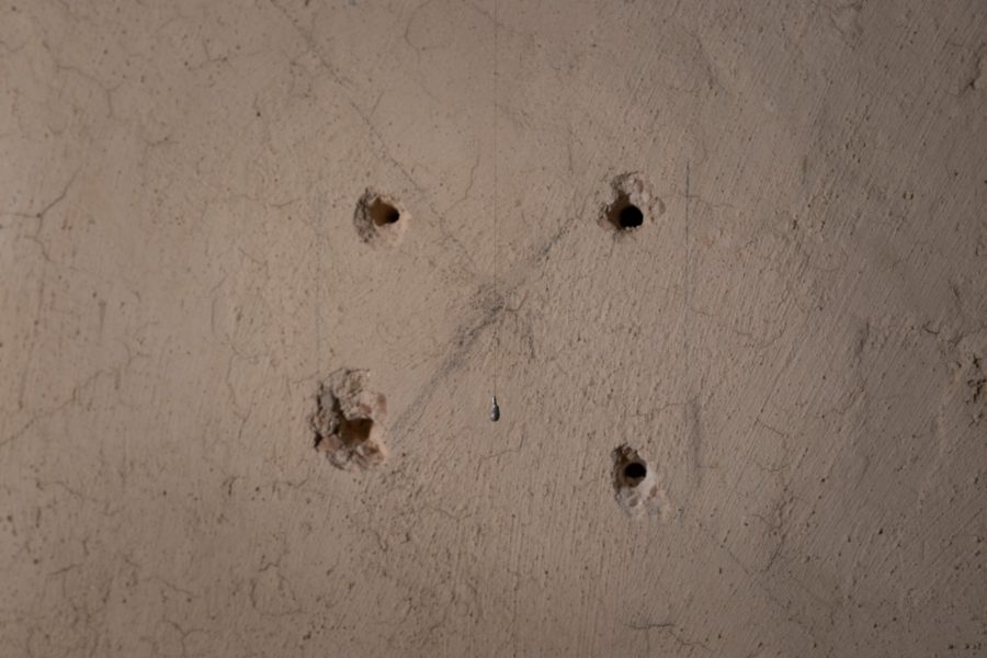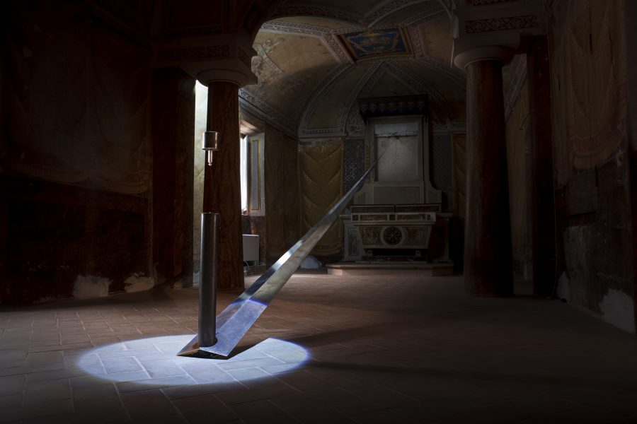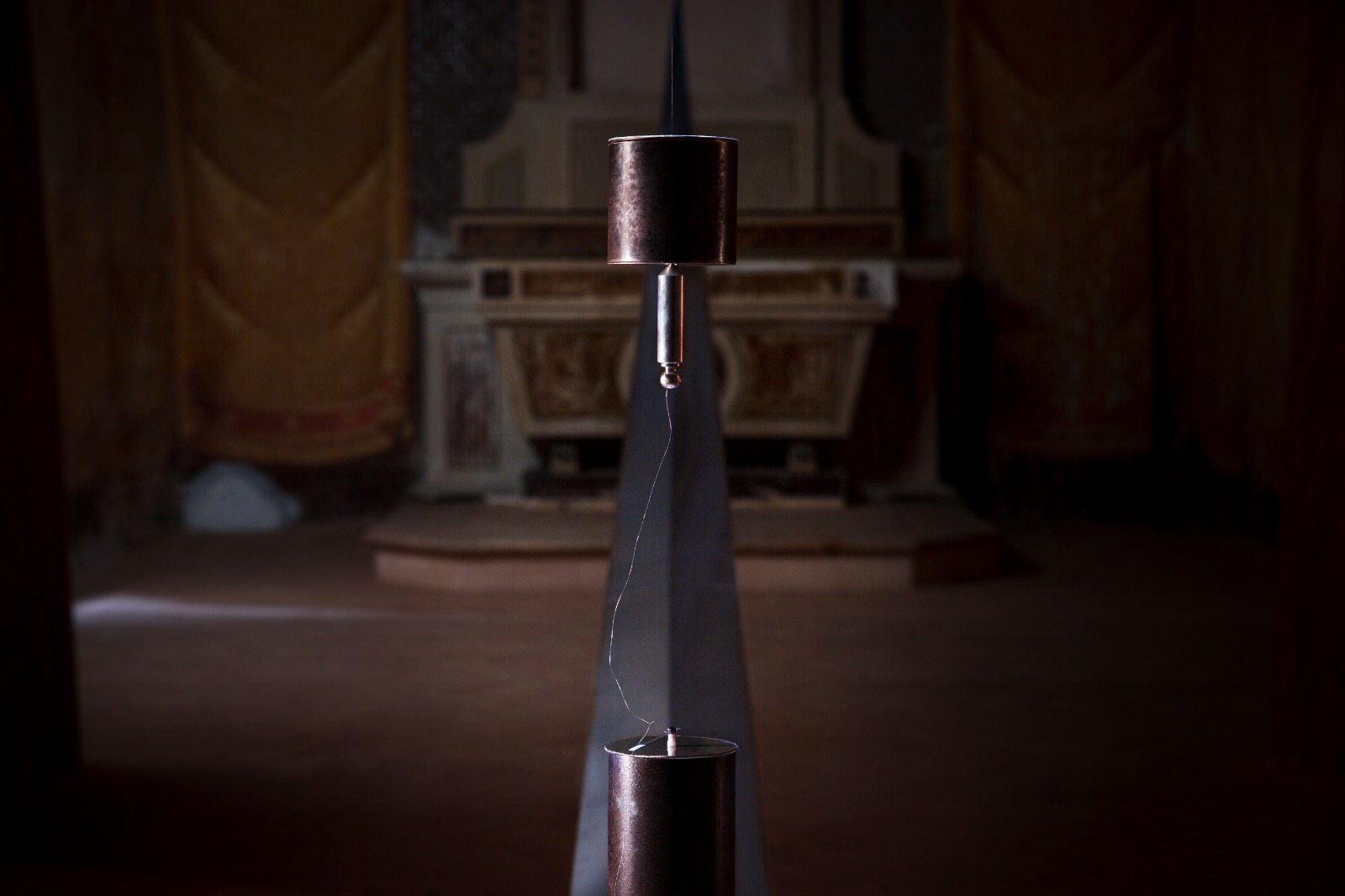 parete dell’altare. Incorniciato da quattro fori, con lucesoffusa, compare una goccia di stagno sorretta da un capello nero.