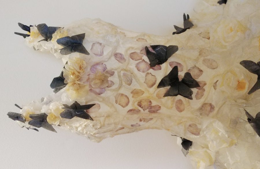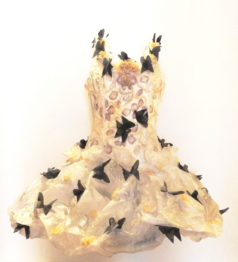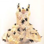 Questo abito scultura indossabile rappresenta per me la poetica della bellezza, realizzato da appunti di elementi naturali raccolti, rose ed orchidee, che compongono lo svolazzamento delle emozioni interiori quando ci si innamora. Avvolti dalle farfalle e dai sogni.