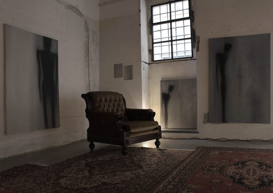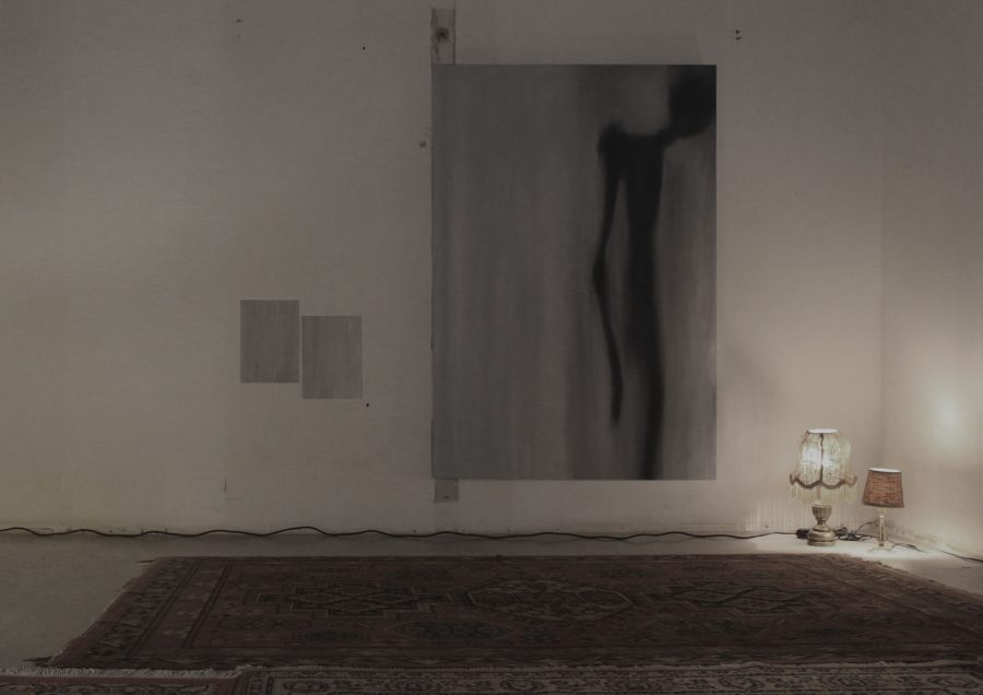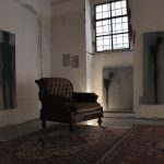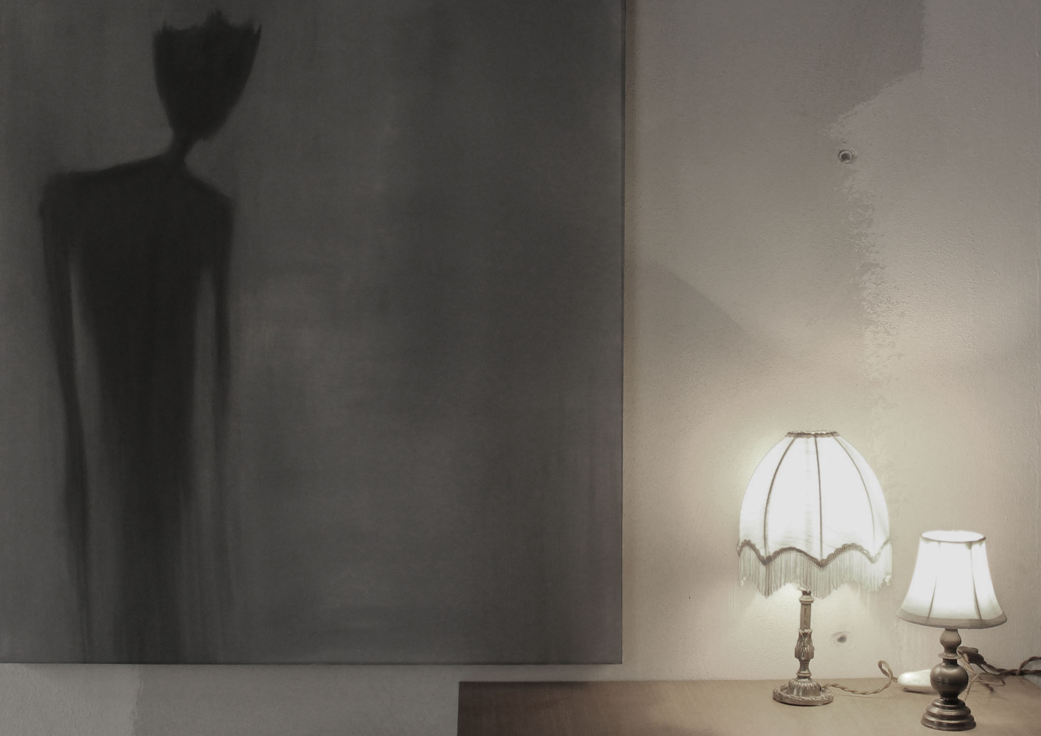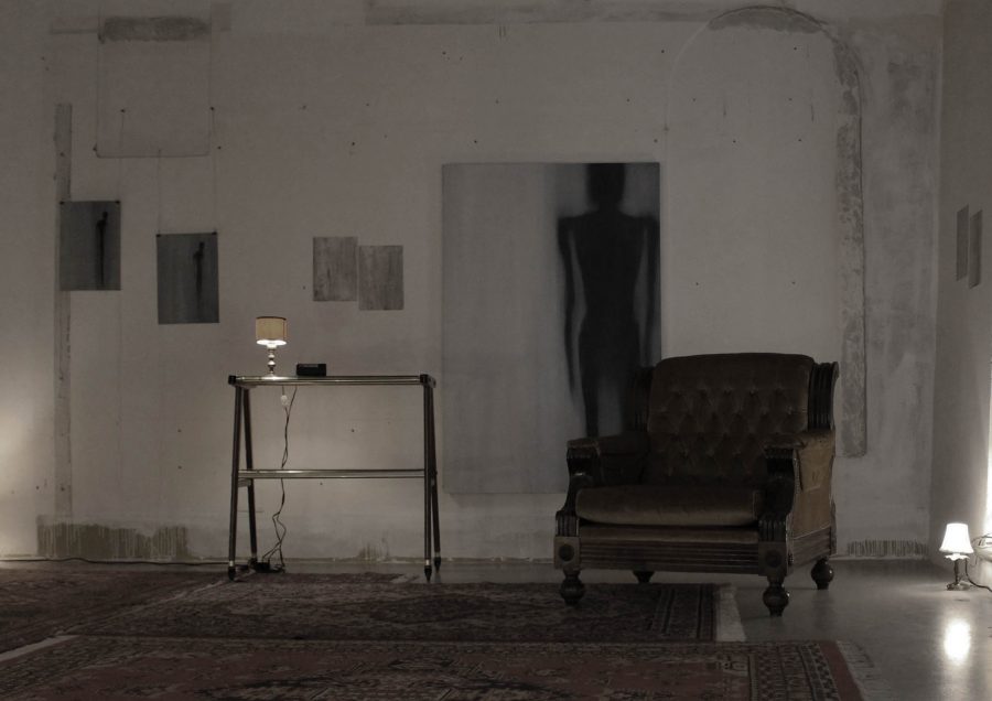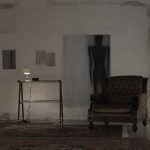 tavoli, comodini, lampade con paralume, lampadario in ottone, registratore a cassette portatile, poltrona, tappeti