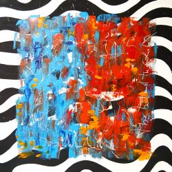 La PACE è la condizione che trascina altri valori essenziali per gli esseri umani, come libertà, giustizia e democrazia. Questo anelito è rappresentato nell’opera da 2 circonferenze con una serie di cerchi concentrici all’interno, che richiama lo schema di un mandala. Le due figure geometriche sono formate da nastri di cartoncino curvati a volute, di dimensioni digradanti, nei colori della Pace.