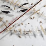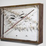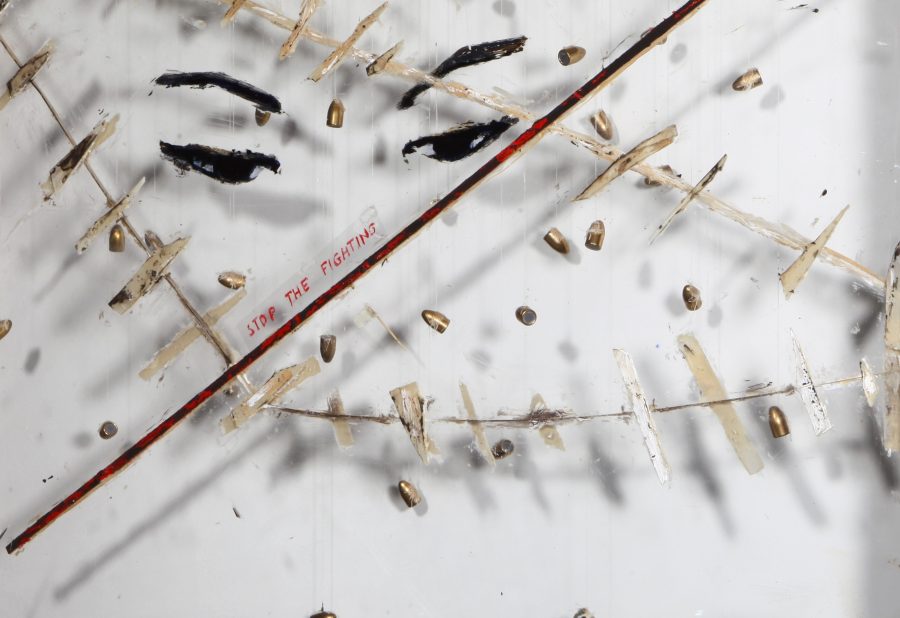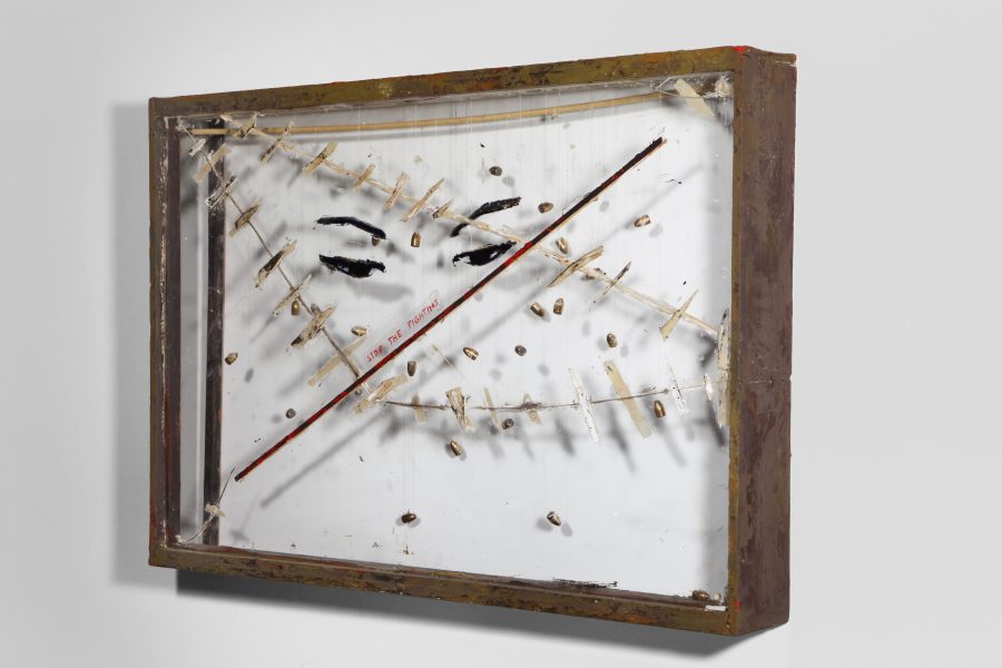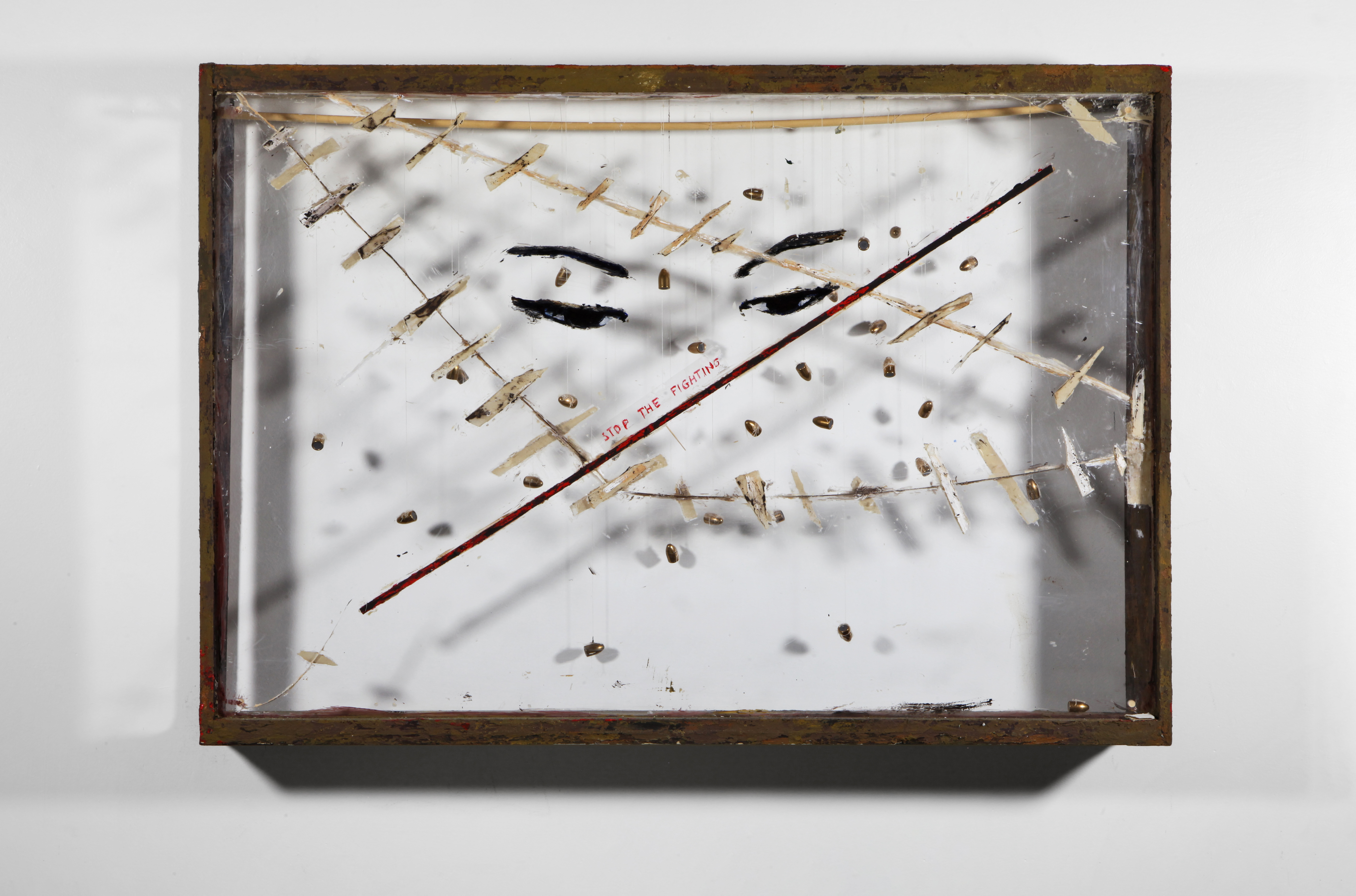 acrilico, pasta acrilica su plexiglas, legno, proiettili, stoffa, garza, filo, chiodi. Opera unica