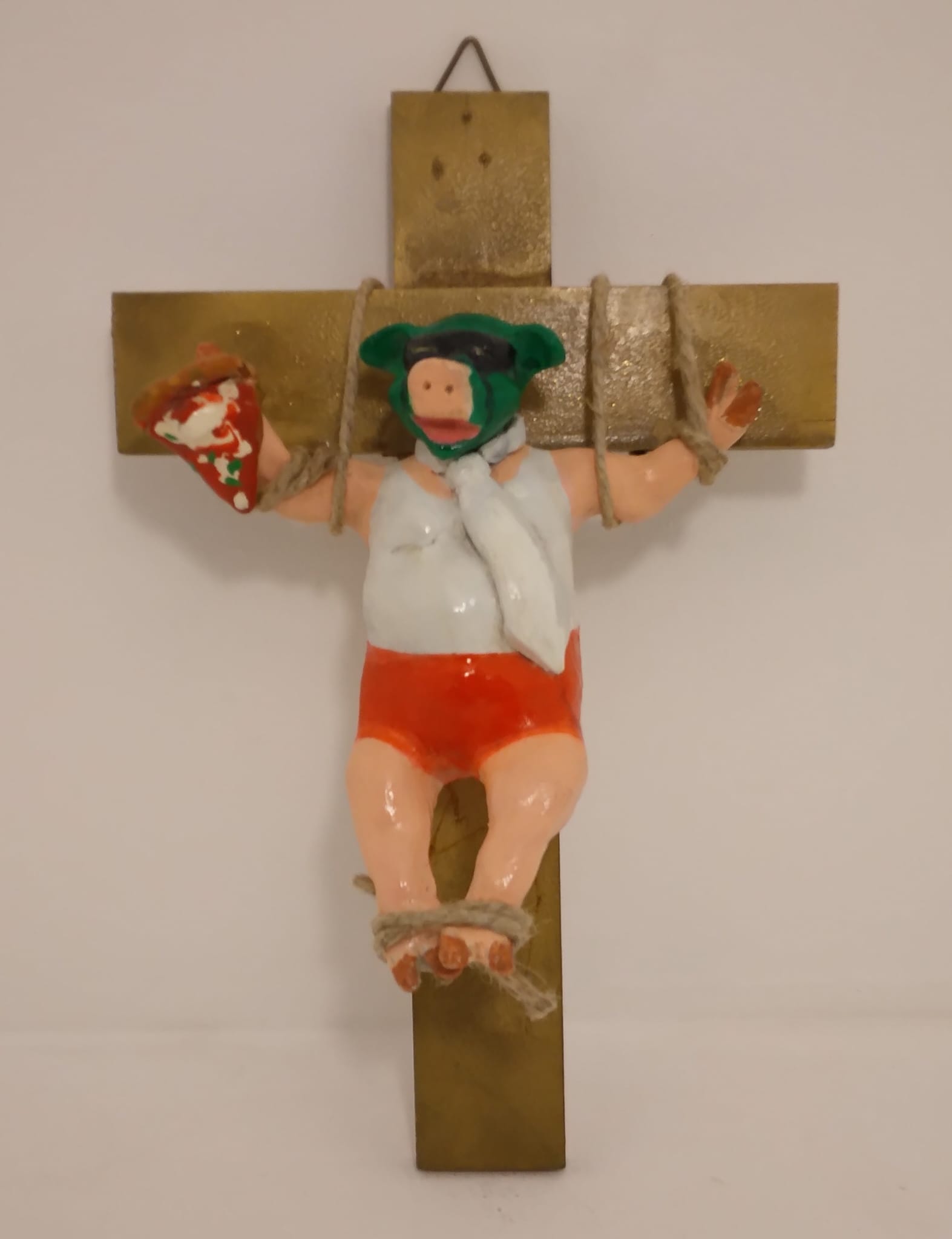 La figura zoomorfa, vividamente dipinta a olio, è fissata a una croce dorata, l'accostamento tra la raffinata tecnica della ceramica e la doratura a freddo della croce enfatizza il contrasto tra l'aspirazione al sacro e la natura posticcia della realtà contemporanea. L'opera esplora il martirio del "maiale sociale", vittima di un consumo compulsivo che diventa l'unico rito rimasto in una società svuotata di spiritualità. L'opera incorpora i colori della bandiera italiana, trasformando il soggetto in un'incarnazione grottesca della nazione stessa.